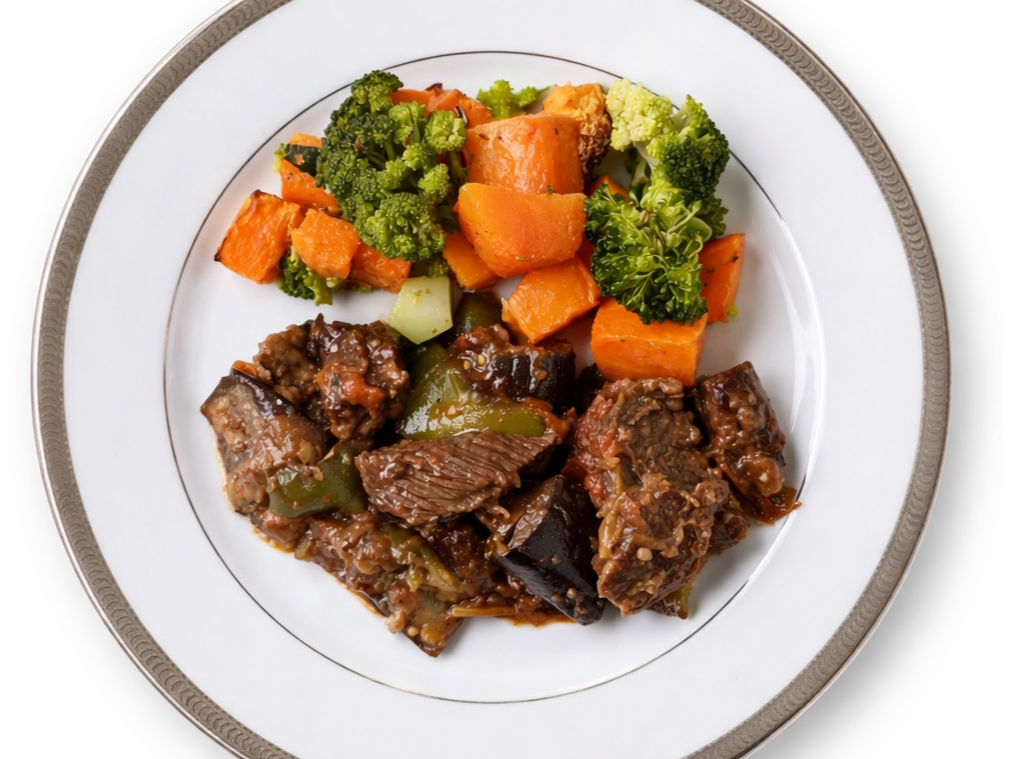 TERNERA BRASEADA CON BERENJENA CALABACIN Y BROCOLI ASADO. KETO
