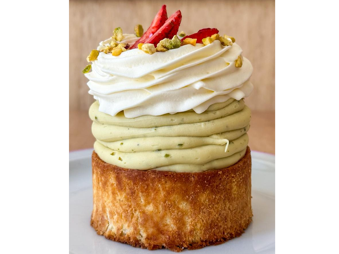Brownie de chocolate blanco, ganache de pistachos rellenos de pasta de pistachos con kadaif, crema chantilly, coulis de frambuesas y frutillas.