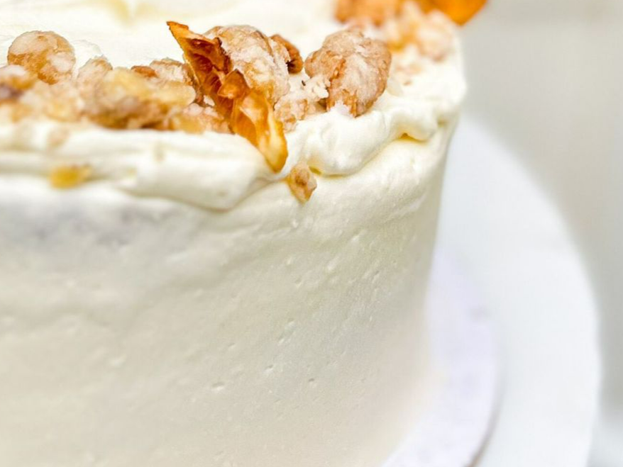 Bizcocho de zanahoria y nuez, relleno de mousse de queso cubierto de frosting con naranjas confitadas y nueces garrapiñadas.