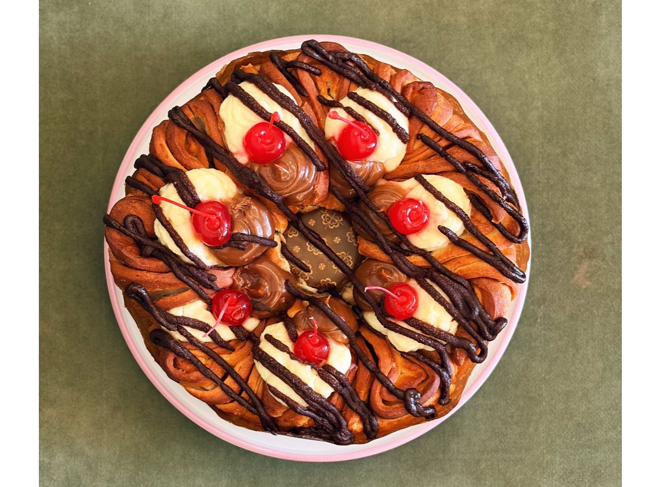 ROSCA DE PASCUA Compartir por WhatsApp Copiar enlace Masa laminada de brioche, rellena de crema pastelera, dulce de leche, chocolate y cerezas al marrasquino. Disponible solo TAKE AWAY$25.000 Observaciones 0 / 150