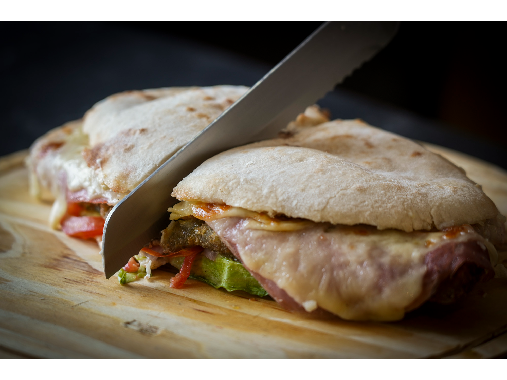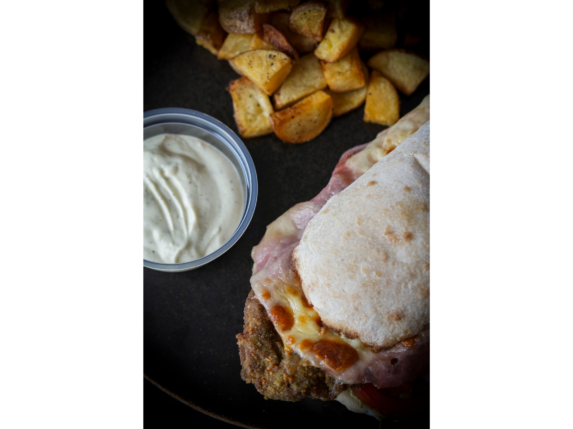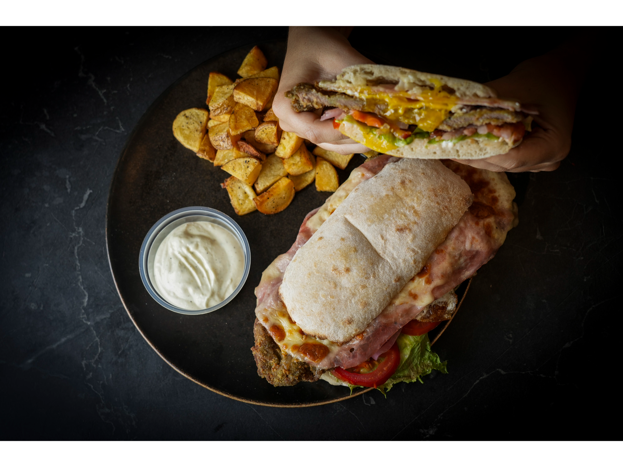 Sandwich de milanesa estilo tucumano gourmet XL Compartir por WhatsApp Copiar enlace Pan panuozzo de masa madre XL, lacto mostaneza de la casa, lechuga repollada, tomate, cebolla morada encurtida, mila de ternera, huevo frito con yema jugosa, queso dambo y jamón. (COMEN DOS PERSONAS)$19.900 Observaciones 0 / 150