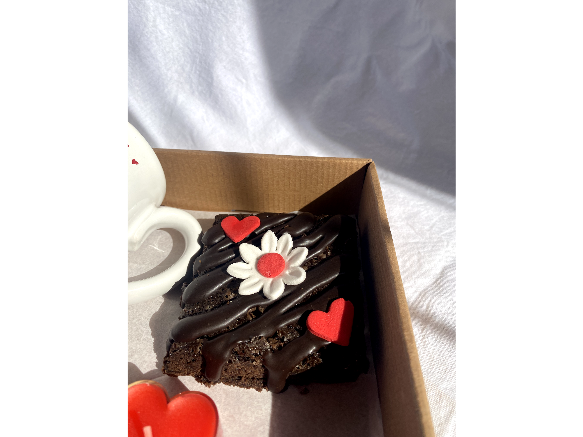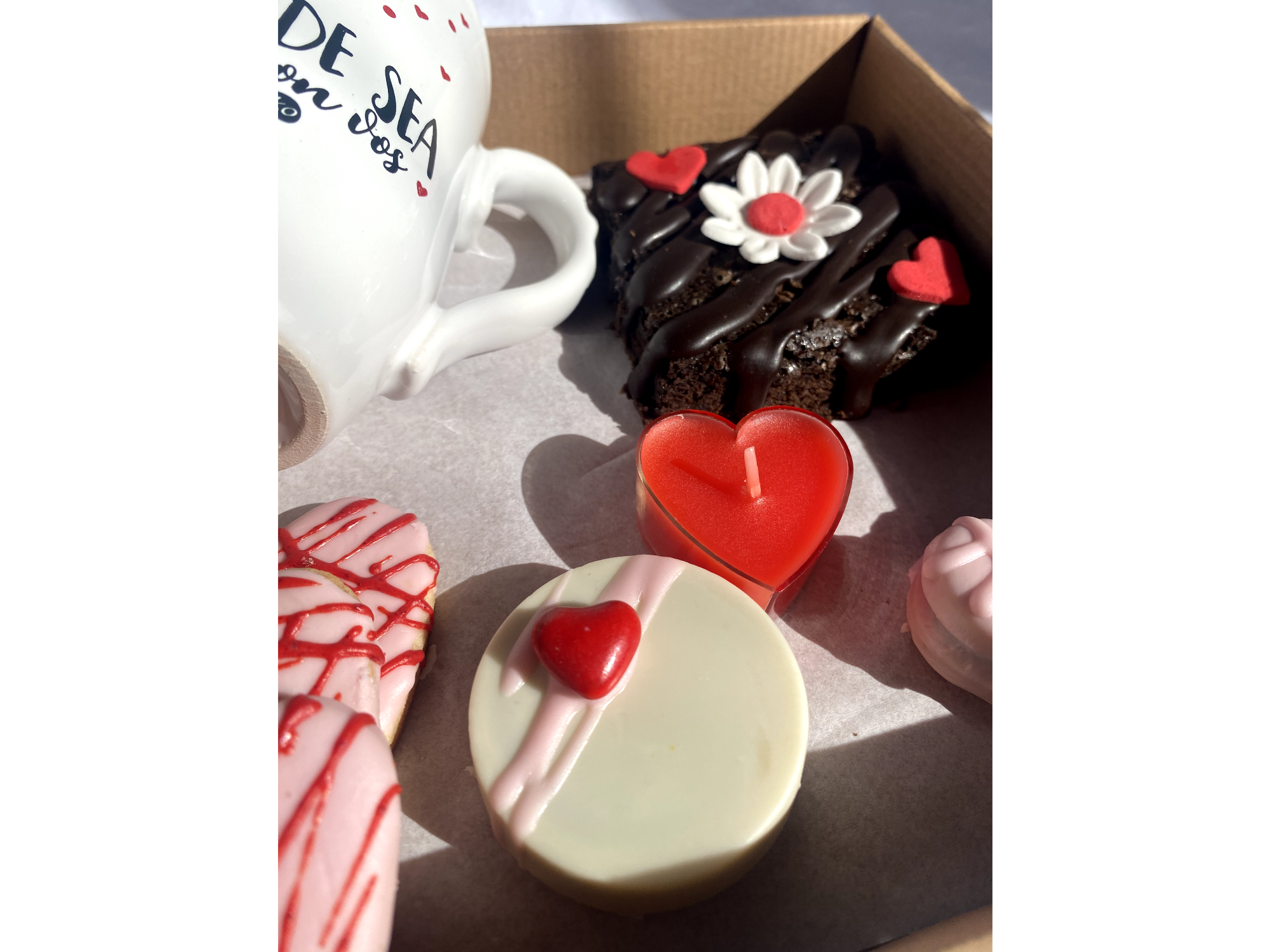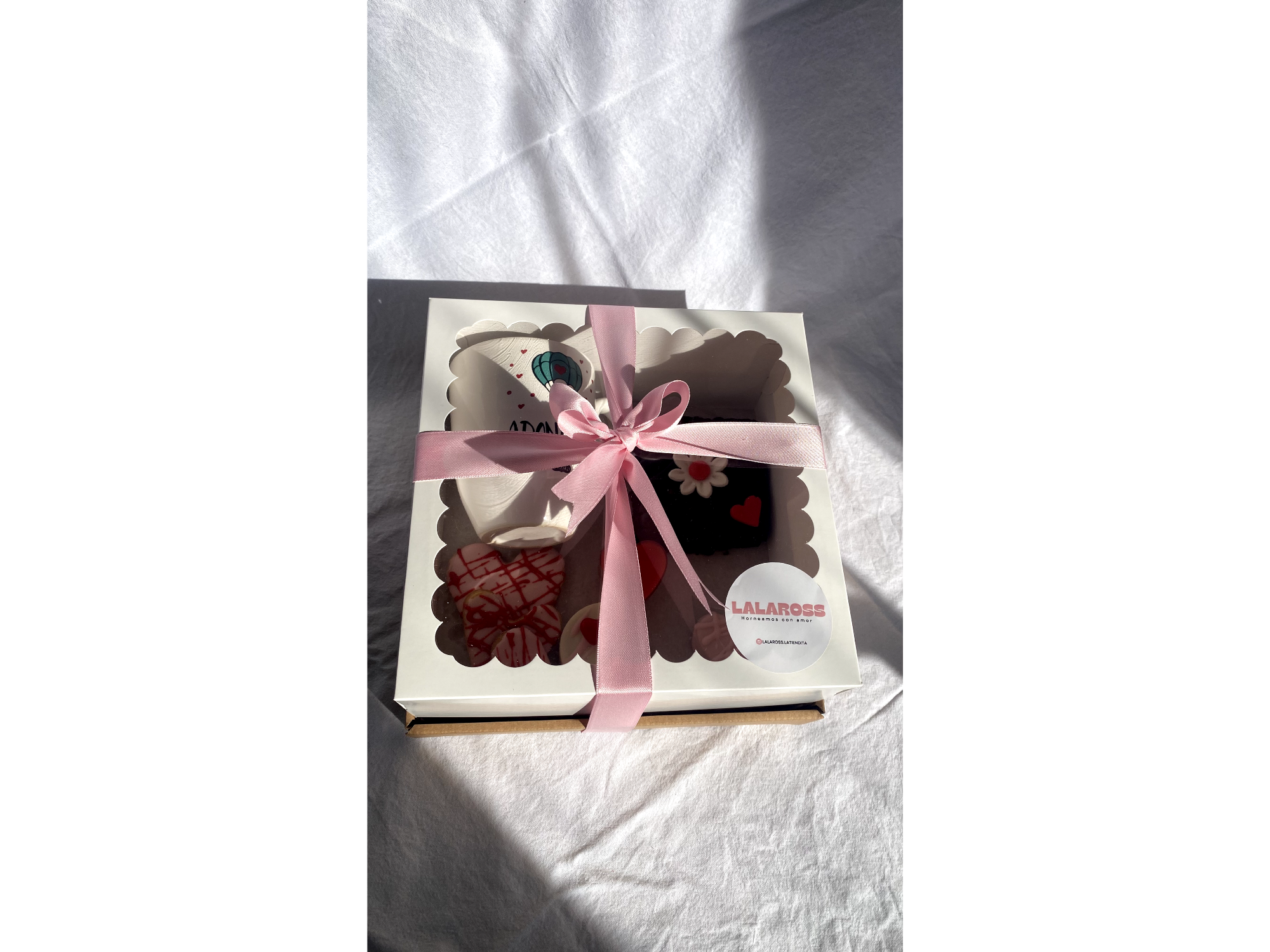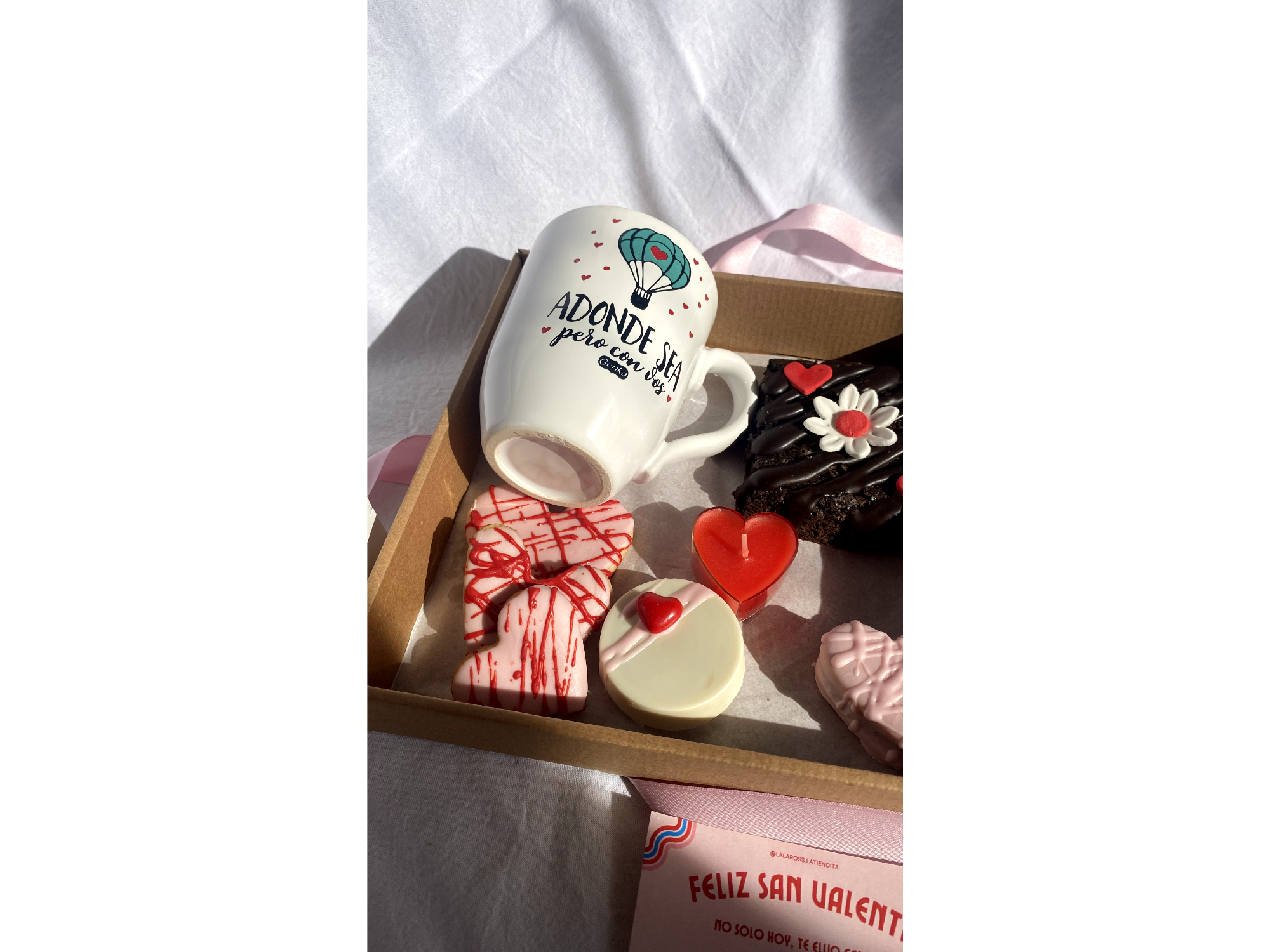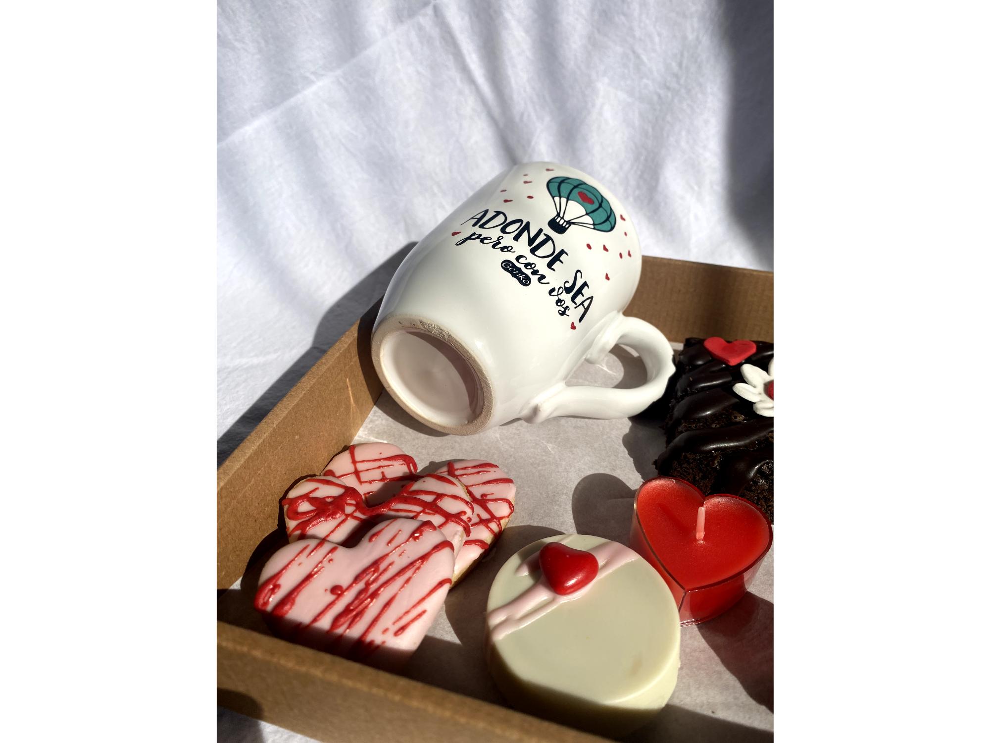 Incluye taza, velita en forma de corazón, brownie decorado con ganache de chocolate, bocadito Oreo, galletitas con chocolate y alfajor relleno con dulce de leche, recubierto de chocolate.