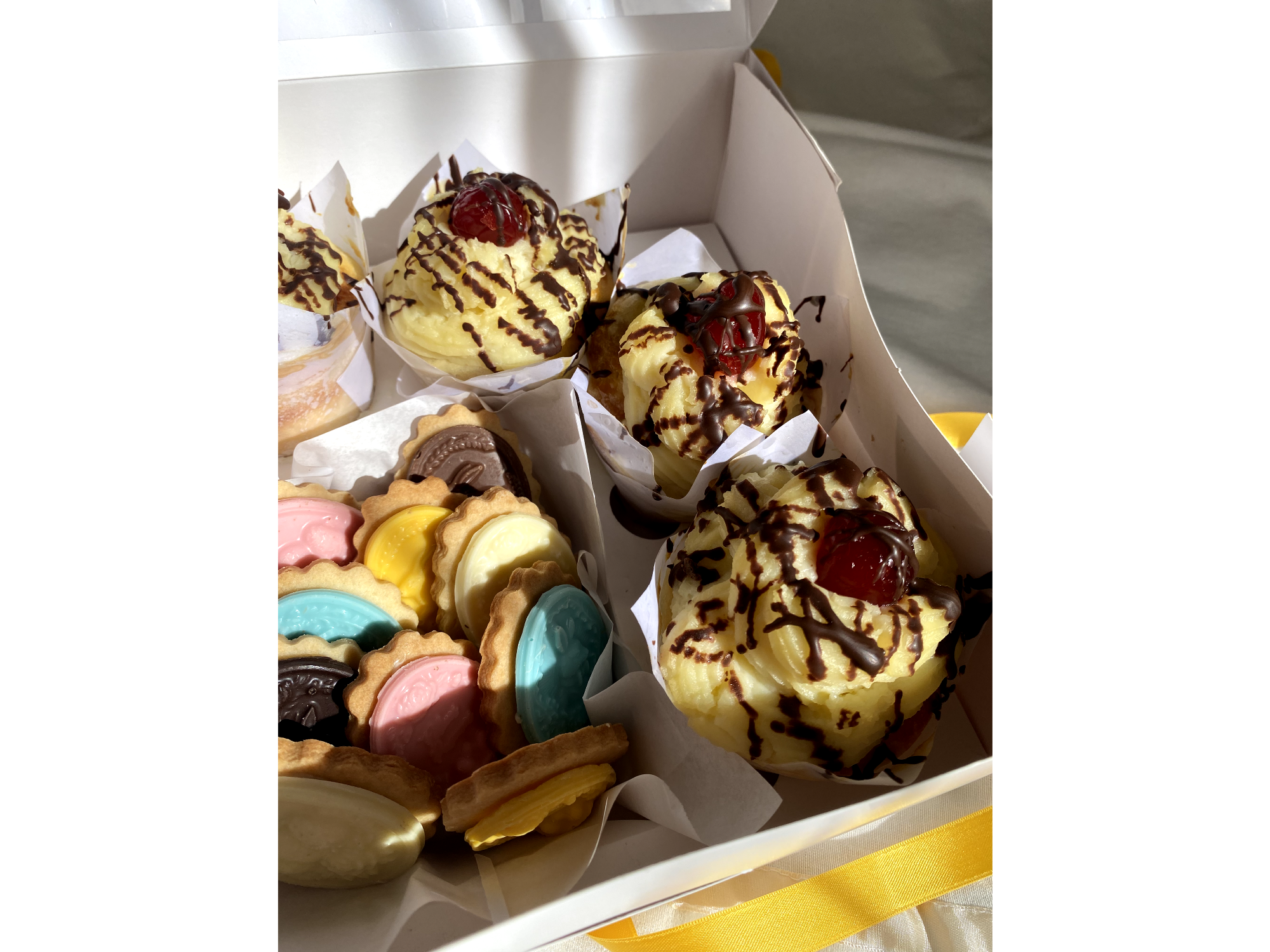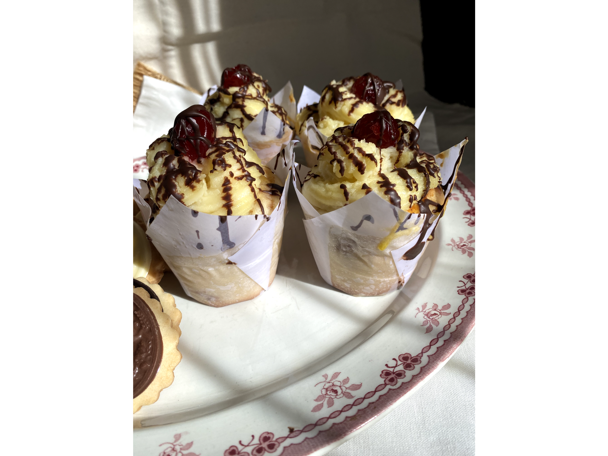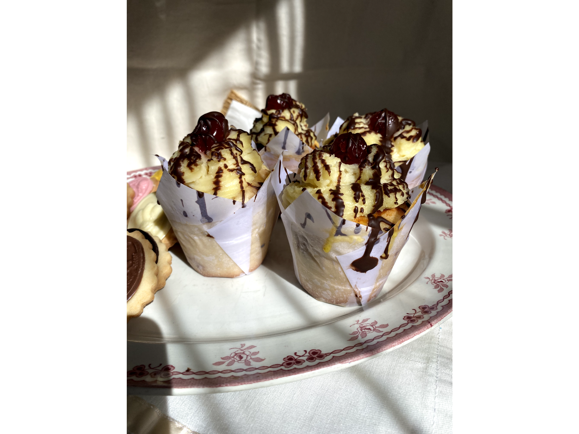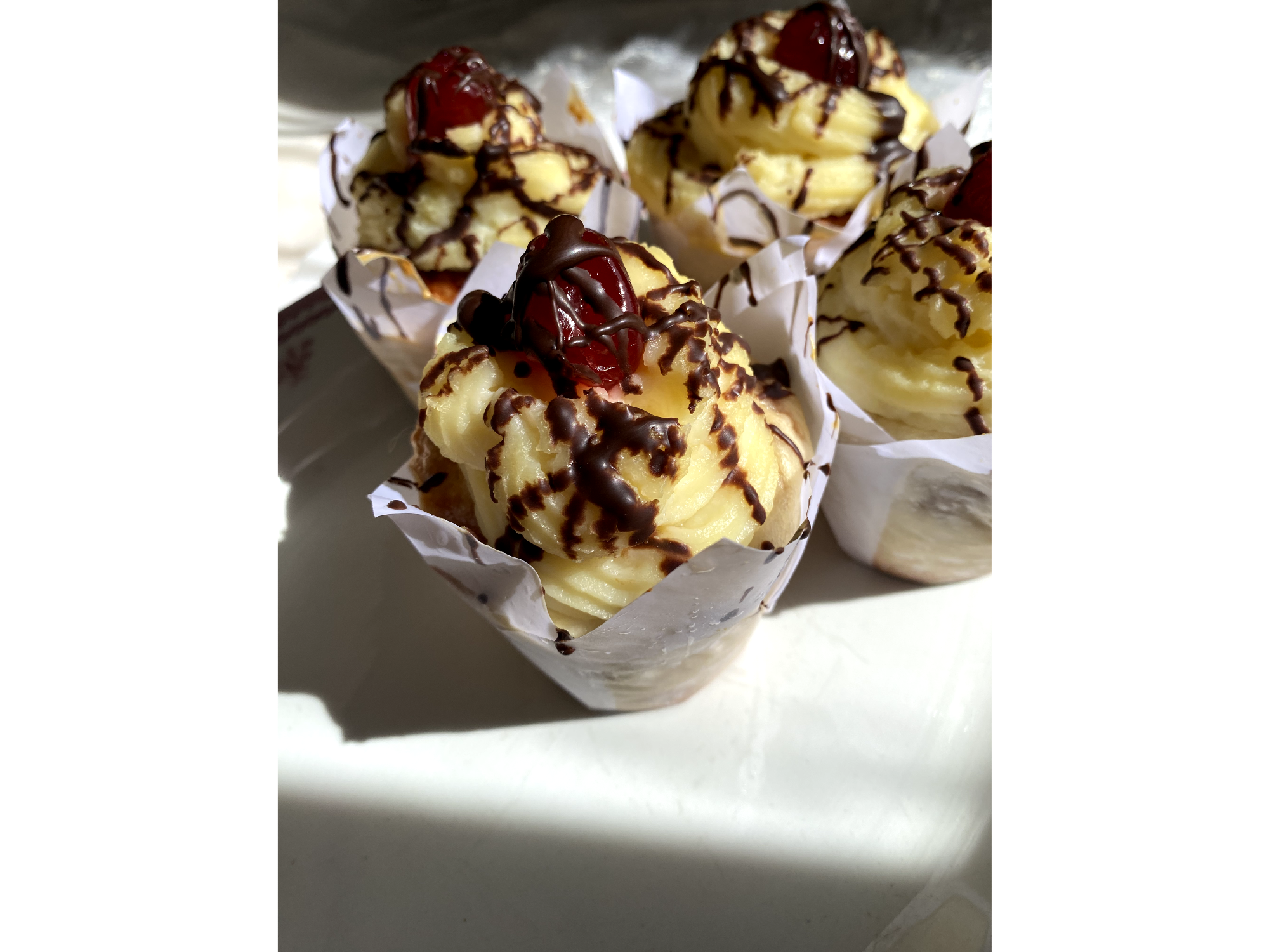Rellenas con dulce de leche, decoradas con crema pastelera, chocolate y cereza