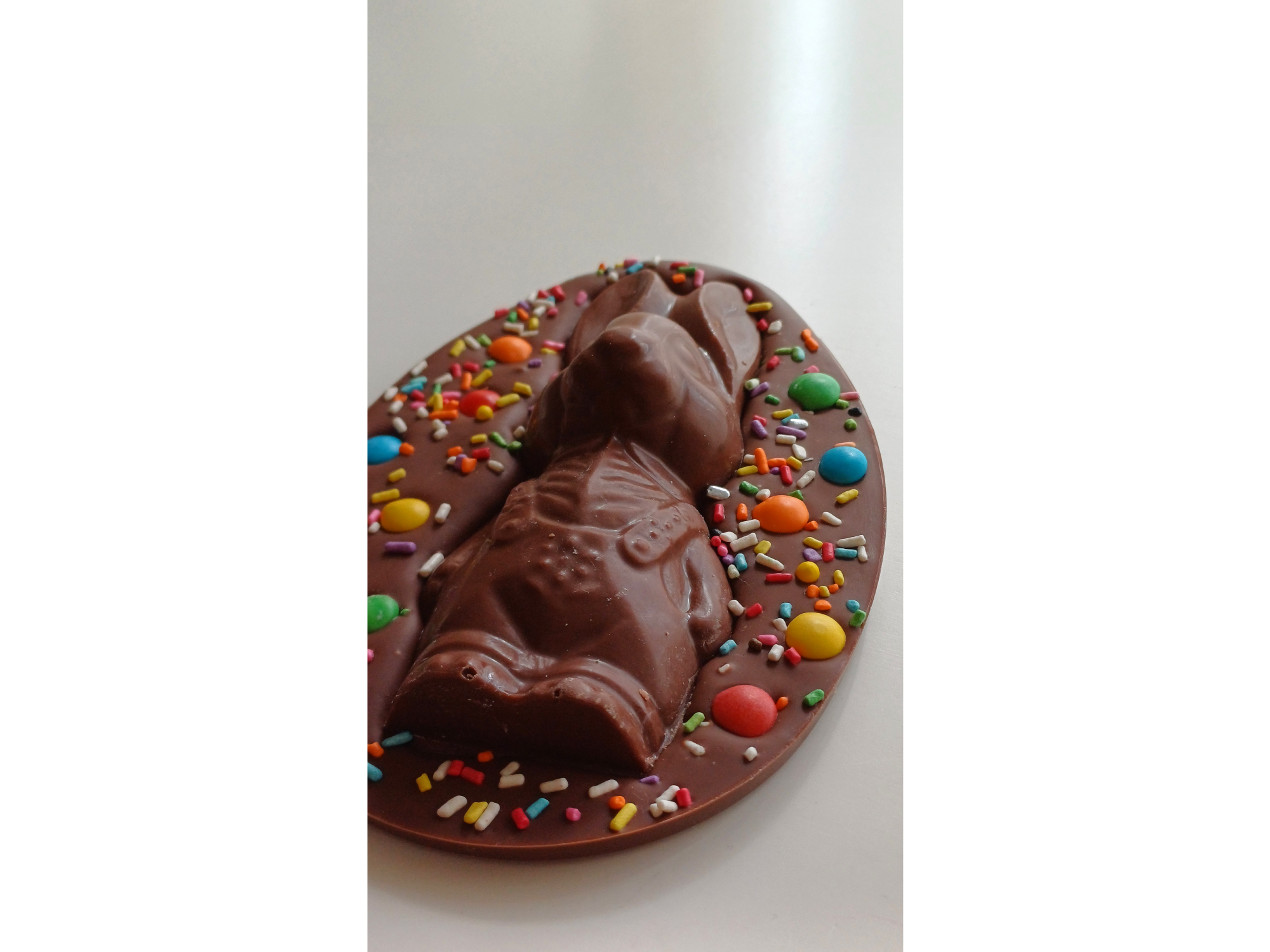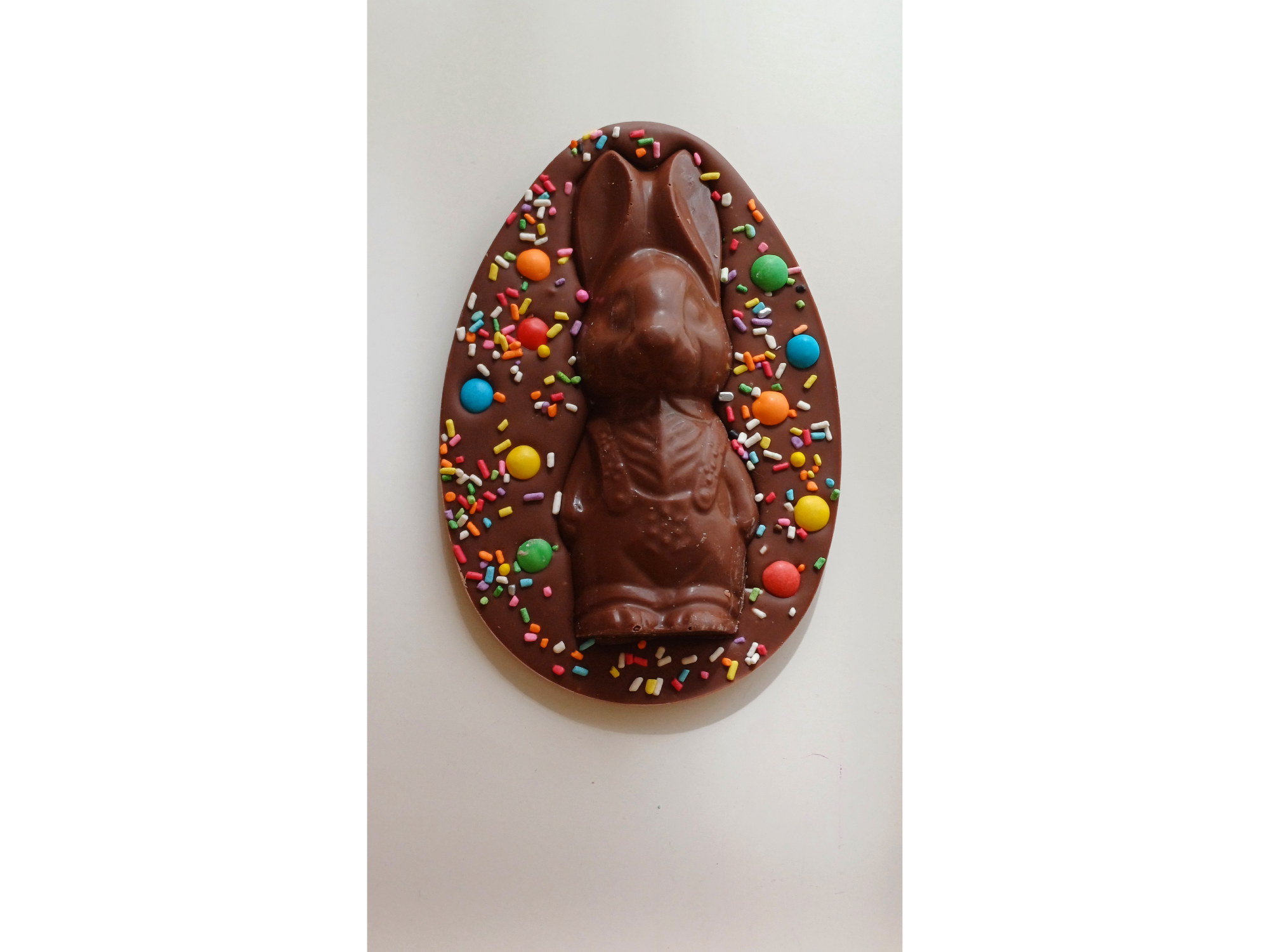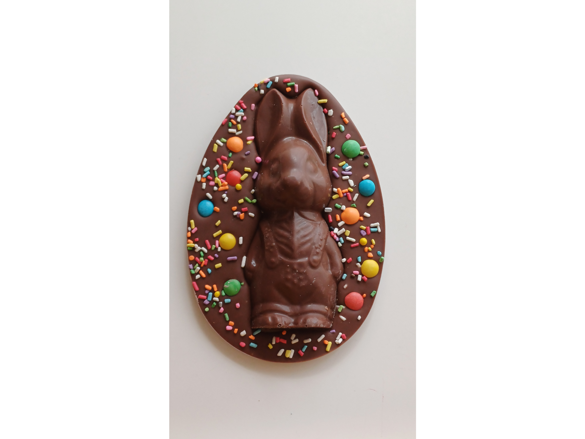 Chocolate con leche, semi amargo o blanco, relleno con dulce de leche y decorado con rocklets, granas de chocolate y conejito de chocolate