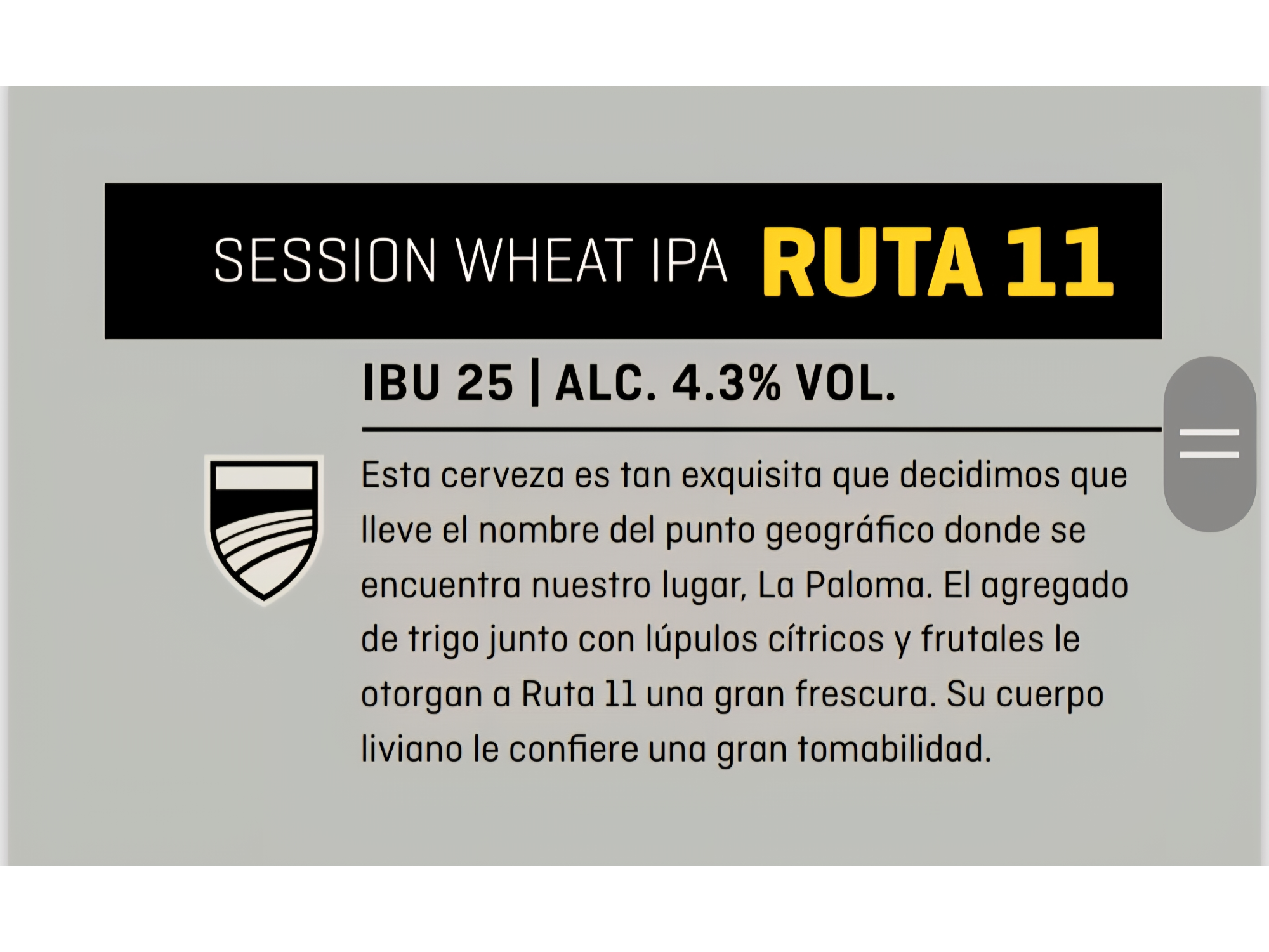 RUTA 11 (1/2 pinta - session ipa) Compartir por WhatsApp Copiar enlace Cerveza artesanal de La Paloma$4.000 Observaciones 0 / 150