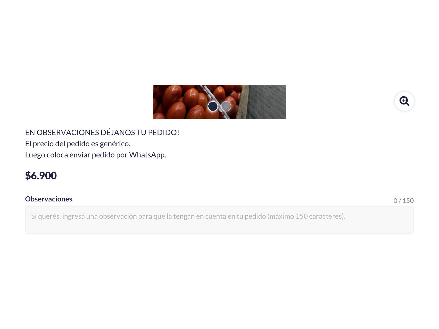 EN “OBSERVACIONES” DÉJANOS TU PEDIDO Y LUEGO COLOCA EN “AGREGAR” El precio del pedido es genérico. Luego coloca enviar pedido por WhatsApp.