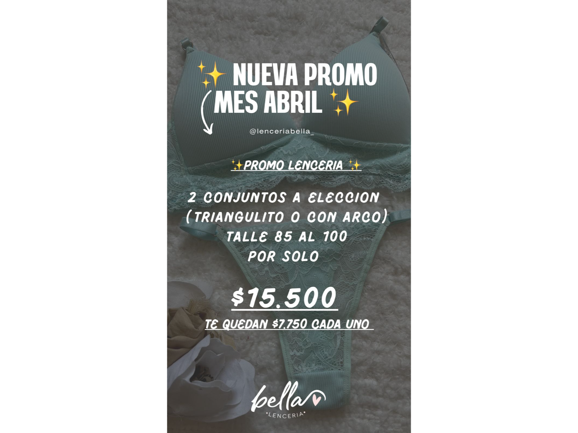 PROMO VIGENTE POR ABRIL! Compartir por WhatsApp Copiar enlace TALLES 85,90,95 Y 100 TALLES 85,90,95 Y 100 (1) PROMO ABRIL. DOS CONJUNTOS A ELECCION $17.800$15.500 13% OFF
