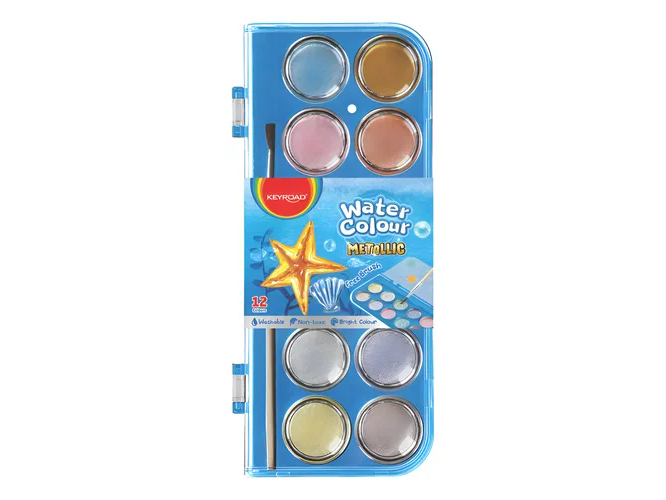 Colores suaves y lavables en formato paleta de 12 tonos + pincel incluido, ideales para actividades creativas escolares y proyectos de arte básicos. Perfectas para pintar degradés, mezclas delicadas y trabajos de expresión artística. Especificaciones técnicas • Marca: Keyroad • Presentación: Paleta plástica con 12 pastillas • Colores: Tonos pastel lavables • Incluye: 1 pincel • Uso recomendado: Escolar, arte y pintura básica • Tipo de pintura: Acuarela lavable para papel escolar