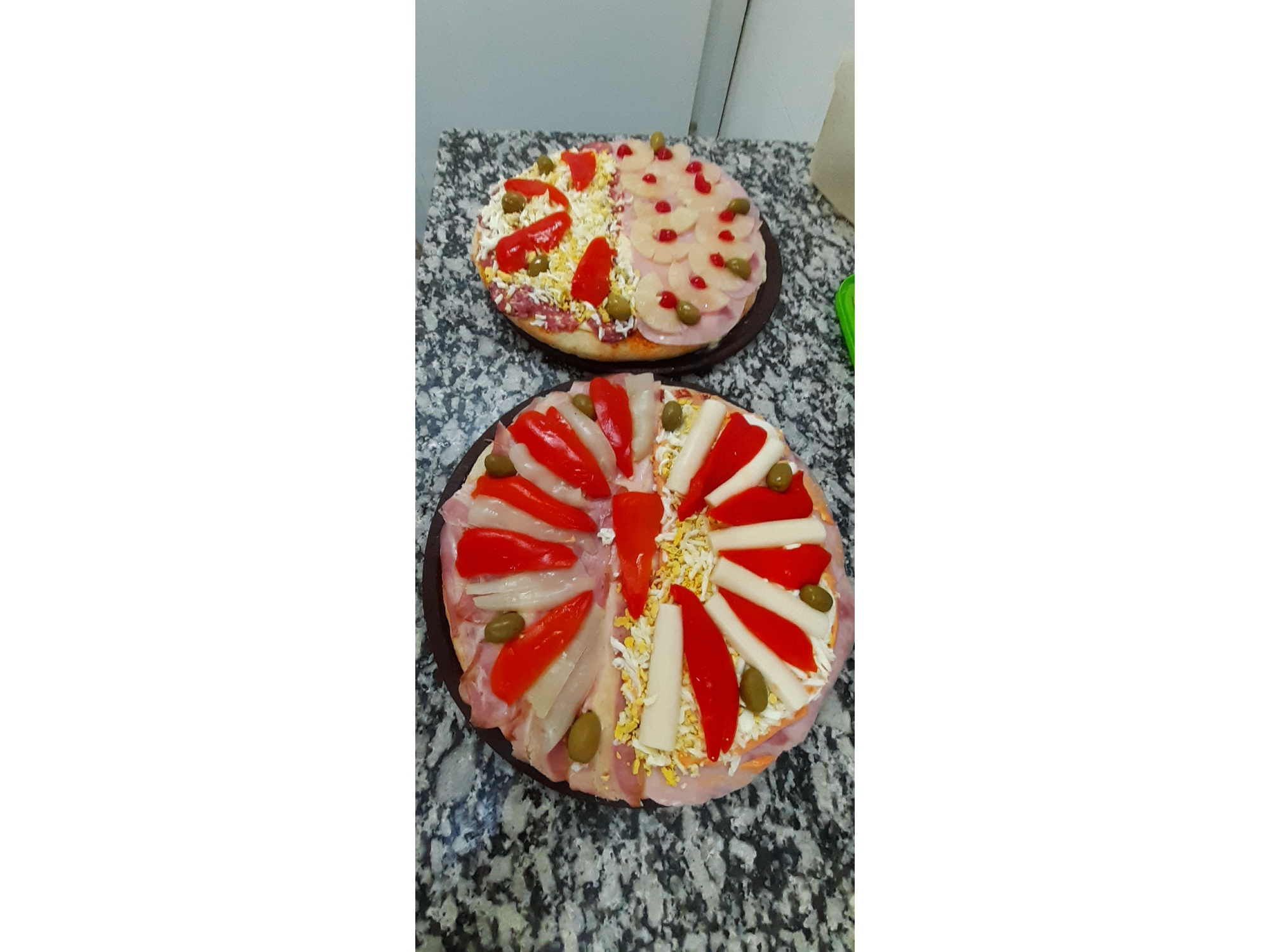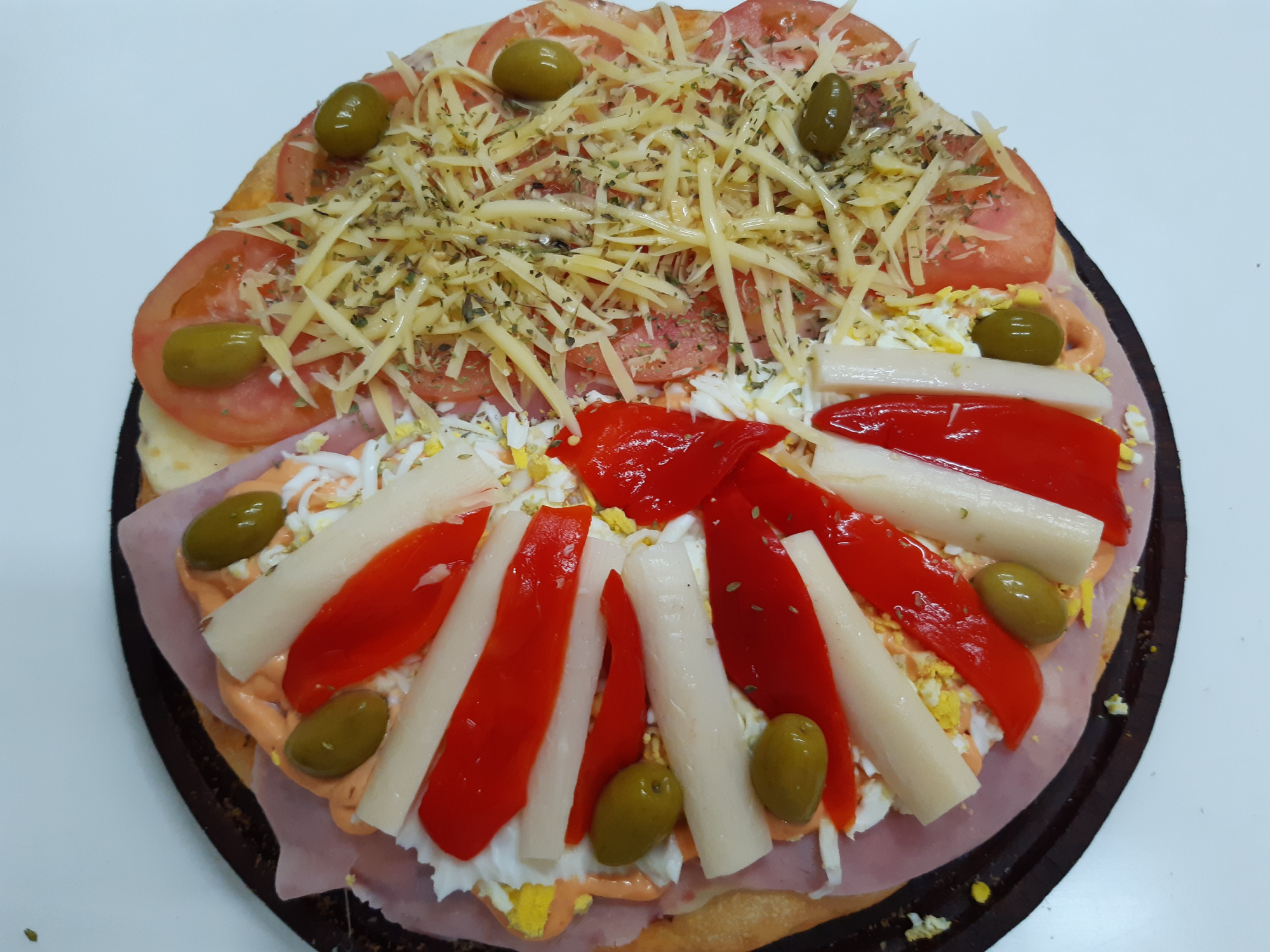 Pizza mitad y mitad Compartir Presentaciones Seleccioná 2 opciones.muzzarella Salsa de tomate, muzzarella, aceitunas y orégano $8.500Fugazzeta Salsa de tomate, muzzarella, Cebolla, aceitunas y orégano $10.000Muzzarella con huevo Salsa de tomate, muzzarella, Huevo picado y aceitunas $10.000Primavera Salsa de tomate, muzzarella, huevo picado, Morrones y aceitunas $10.500Muzzarella con jamón Salsa de tomate, muzzarella, Jamón Y aceitunas $10.000Jamón con huevo Salsa de tomate; muzzarella, jamón Huevo picado y aceitunas $11.000Muzzarella con morrón Salsa de tomate, muzzarella Morrones y aceitunas $11.000Especial Salsa de tomate, muzzarella, Jamón, morrones y aceitunas $11.500Especial con huevo Salsa de tomate. Muzzarella, huevo picado Jamón, morrones, y aceitunas $12.500Ahumada Salsa de tomate, muzzarella, panceta ahumada, morrones y aceitunas $12.000Ahumada con ají Salsa de tomate, muzzarella, Panceta ahumada, ají en vinagre Morrones y aceitunas $12.500Napolitana Salsa de tomate, muzzarella, Tomates en rodajas, ajo, queso rallado Orégano Y aceitunas $11.500Napolitana con huevo Salsa de tomate, muzzarella, tomates En rodajas, huevo picado, Queso rallado, orégano y aceitunas $12.500Romana Salsa de tomate, muzzarella, jamón. Tomates en rodajas, queso rallado, orégano y aceitunes $13.000Calabresa Salsa de tomate, muzzarella, rodajas de Longaniza, huevo picado, morrones y aceitunas $11.500Carbonara Salsa de tomate, muzzarella, 8 huevos fritos, panceta ahumada y aceitunas $13.000Americana Salsa de tomate, muzzarella, 8 huevos Fritos, jamón, Morrones y aceitunas $13.000Roquefort Salsa de tomate, muzzarella, roquefort Morrones y aceitunas $11.500Roquefort con Jamón Salsa de tomate, muzzarella, roquefort. Jamón, morrones y aceitunas $13.000Cuatro quesos Salsa de tomate, muzzarella Roquefort, regianito, provolone y aceitunas $12.500De la casa Salsa de tomate, muzzarella, jamón, Salsa golf, huevo picado. Palmitos, morrones, y aceitunas $13.500Palmito Salsa de tomate, muzzarella, Palmitos, salsa golf Morrones y aceitunas $12.000Provolone Salsa de tomate, muzzarella, provolone aceitunas y orégano $13.000 Observaciones 0 / 150