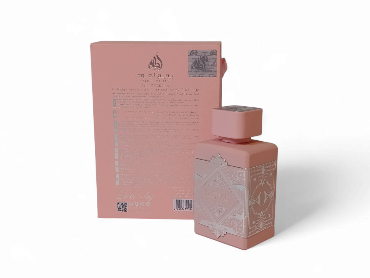 Lattafa Bade'e Al Oud Noble Blush ofrece una muy buena duración, generalmente perceptible en la piel entre 6 y 8 horas, y más en la ropa.