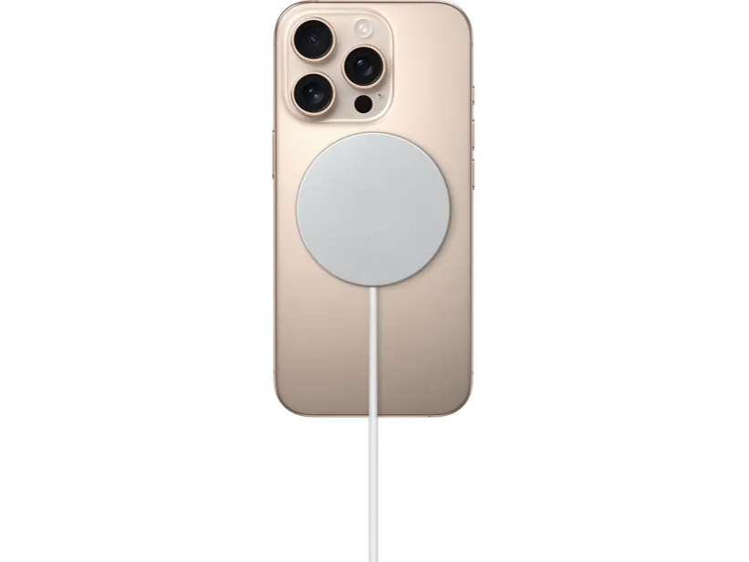 Carregamento sem fio mais rápido de até 25 W, fornecendo até 50% de carga em cerca de 30 minutos para modelos de iPhone 16 e iPhone 16 Pro ao usar um adaptador de energia USB-C de 30 W (vendido separadamente).