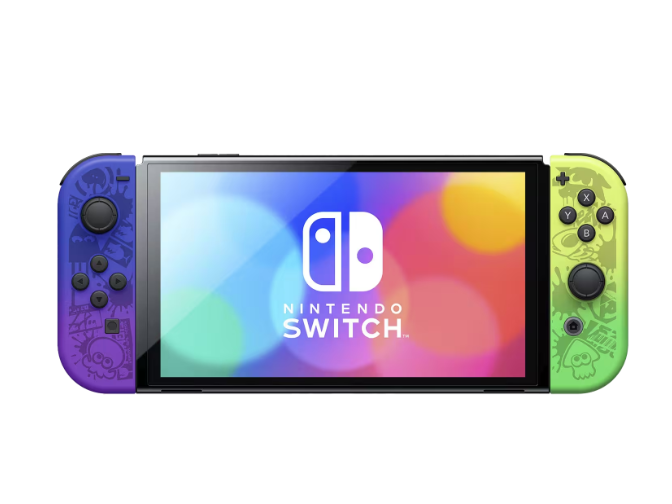 Pinta las Splatlands con estilo con Nintendo Switch Splatoon 3 Edition, que cuenta con un sistema modelo OLED de 7 pulgadas, 64 GB de almacenamiento, amplio soporte ajustable, audio mejorado, controladores Joy-Con degradados en azul y amarillo con una parte inferior blanca, una base blanca adornada con grafito y un fantástico diseño de Splatoon en la parte trasera de la consola portátil.