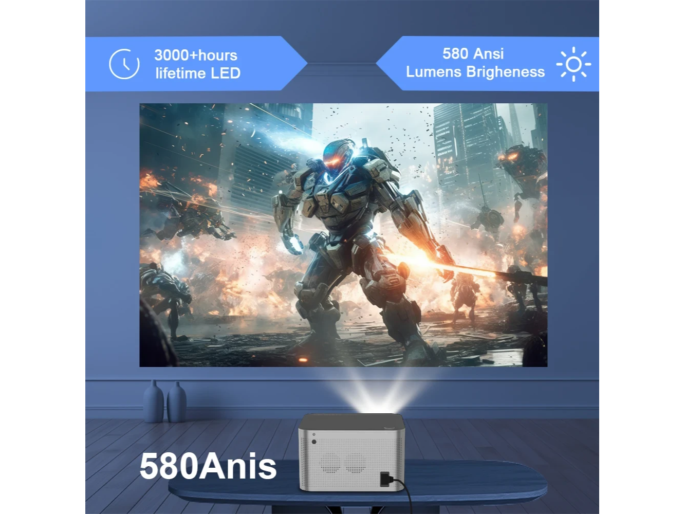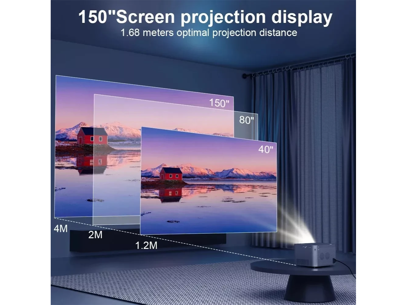proyector inteligente portátil que transforma cualquier pared en pantalla grande. Ofrece conectividad WiFi, soporte para resolución 1080p (compatible 4K), y múltiples entradas HDMI/USB para que puedas conectar consola, notebook, celular o memoria. Ideal para cine en casa, presentaciones o streaming