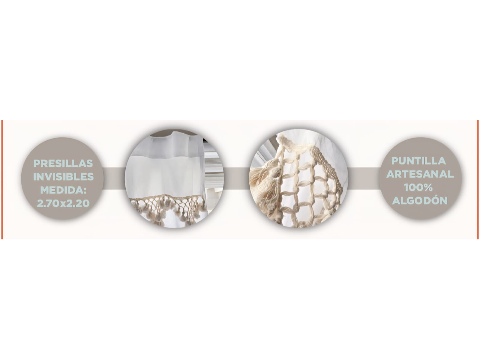 Cortina de ambiente Indú Compartir 2 unidades en stock 100% Algodón Medidas 270x220 cm Puntilla artesanal Color Blanco y Natural$104.000$93.500 10% OFF Observaciones 0 / 150