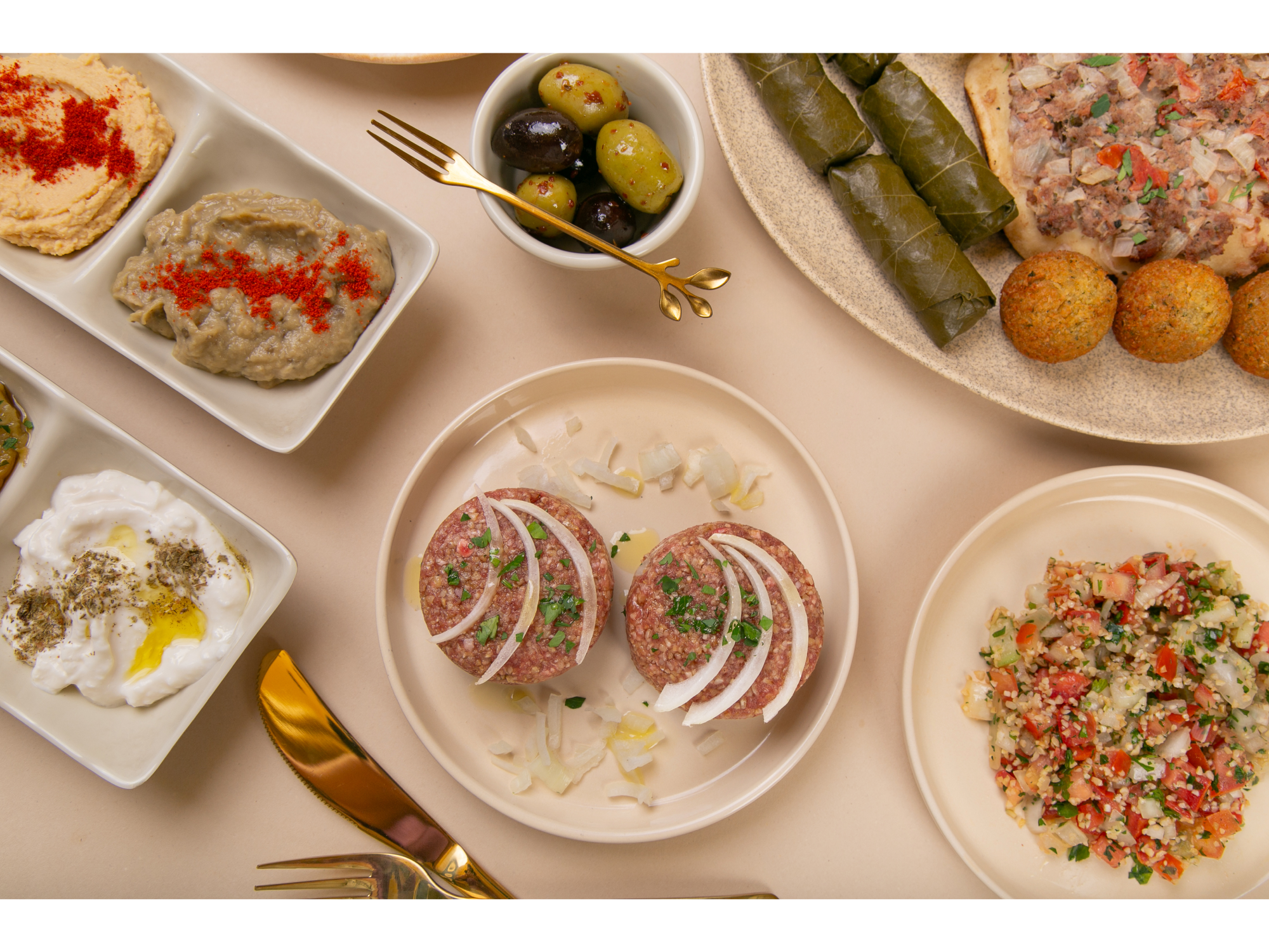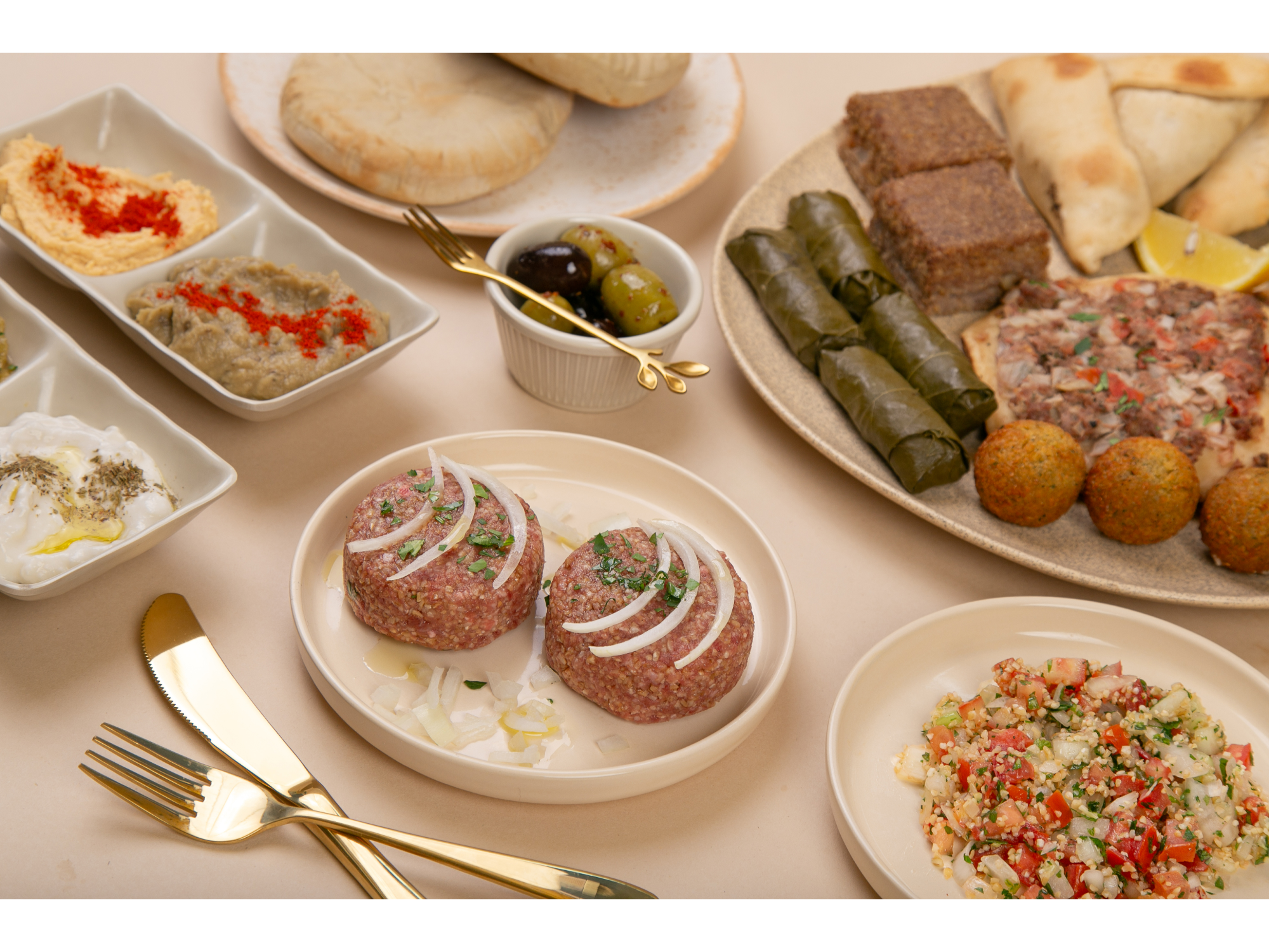 Niño envueltos (2 x persona), quebbe cocido( 1 x persona), quebbe crudo (50 gr por persona), empanada (1 x persona), empanada abierta (1 x persona), berenjena frita (50 gr por persona), pure de garbanzos (50 gr por persona), pure de berenjena (50 gr por persona), laban (50 gr por persona), tabulle (50 gr por persona)