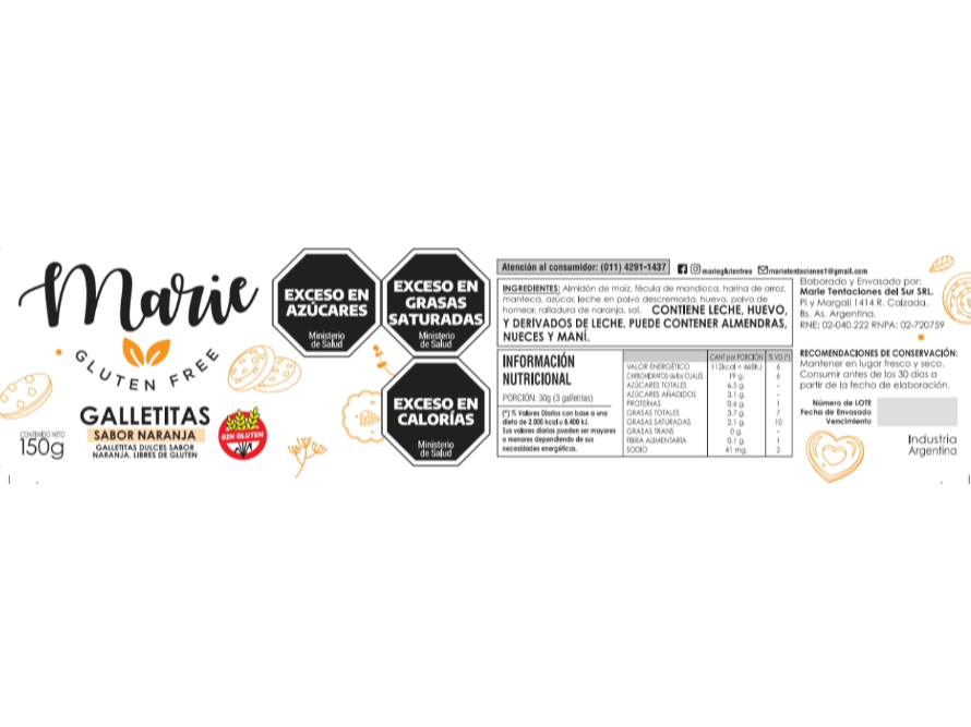 82-Galletitas de naranja (150 gr.)Recomendaciones de conservación: Mantener el producto en un lugar fresco y seco, sin refrigerar ni congelar. Consumir dentro de los 30 días desde su elaboración.$2.600 Observaciones 0 / 150