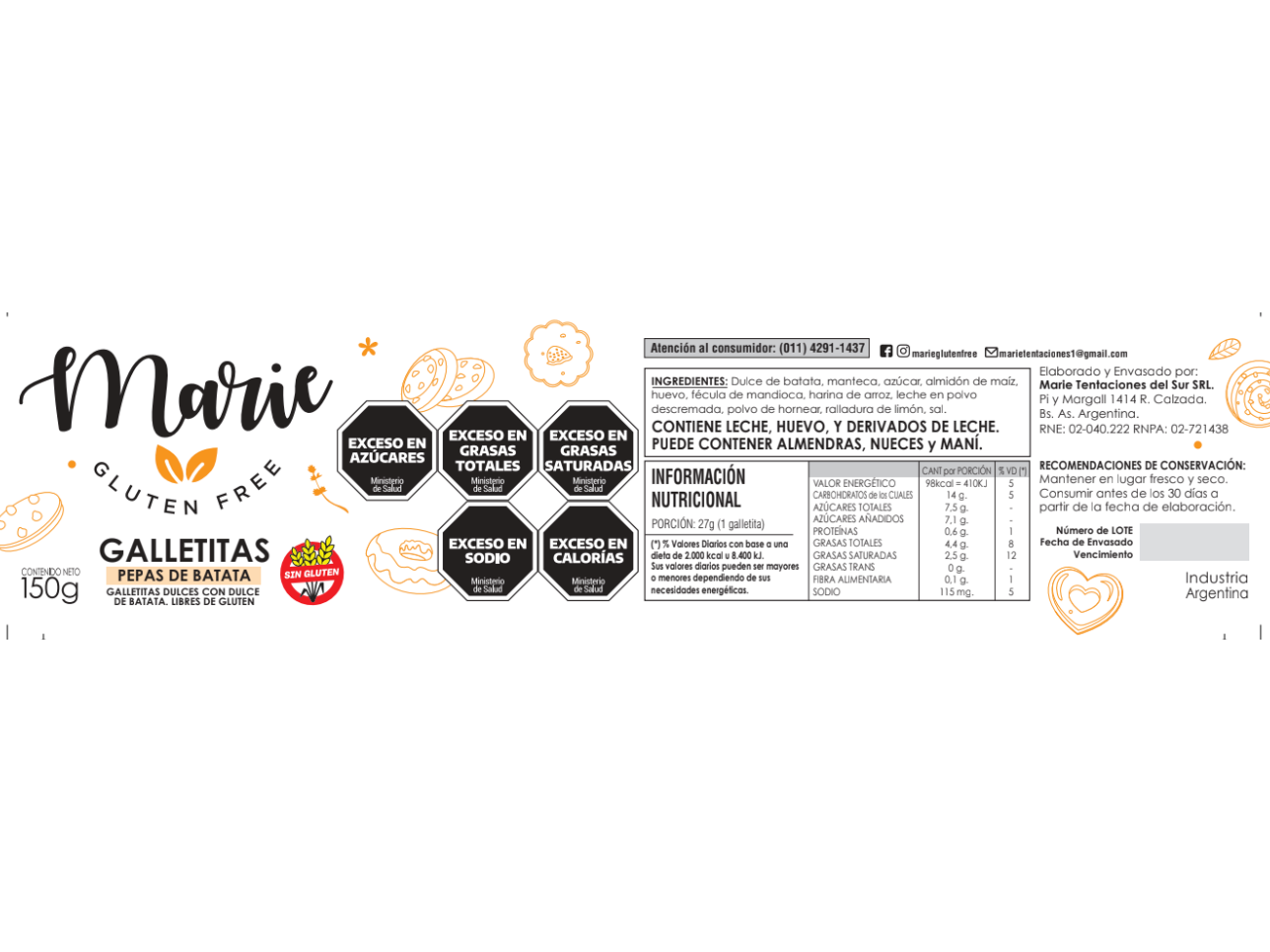 78-Pepas de batata (150 gr.)Recomendaciones de conservación: Mantener el producto en un lugar fresco y seco, sin refrigerar ni congelar. Consumir dentro de los 30 días desde su elaboración.$2.600 Observaciones 0 / 150