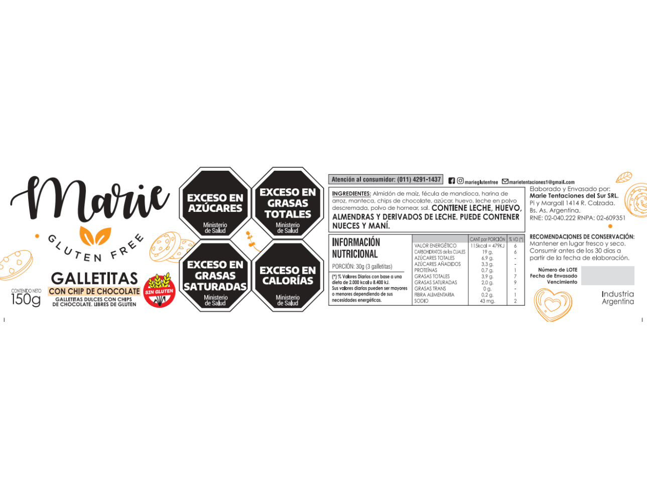 90-Cookies con chips de chocolate (150 gr.)Recomendaciones de conservación: Mantener el producto en un lugar fresco y seco, sin refrigerar ni congelar. Consumir dentro de los 30 días desde su elaboración.$3.400 Observaciones 0 / 150