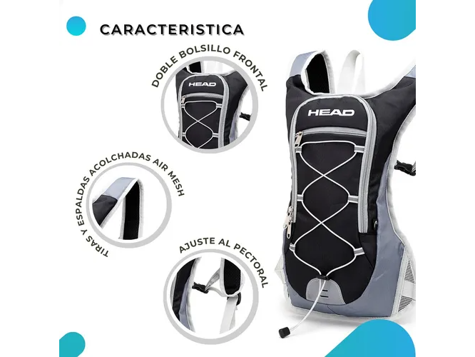 Mochila HEAD running (21728)Tela impermeable. 2 compartimentos. Compartimento principal con compartimento para bolsa hidrante. Con ajuste pectoral Capacidad 7 litros aproximadamente Presentaciones Seleccioná las opciones que quieras.Negro$15.000Azul$15.000 Observaciones 0 / 150