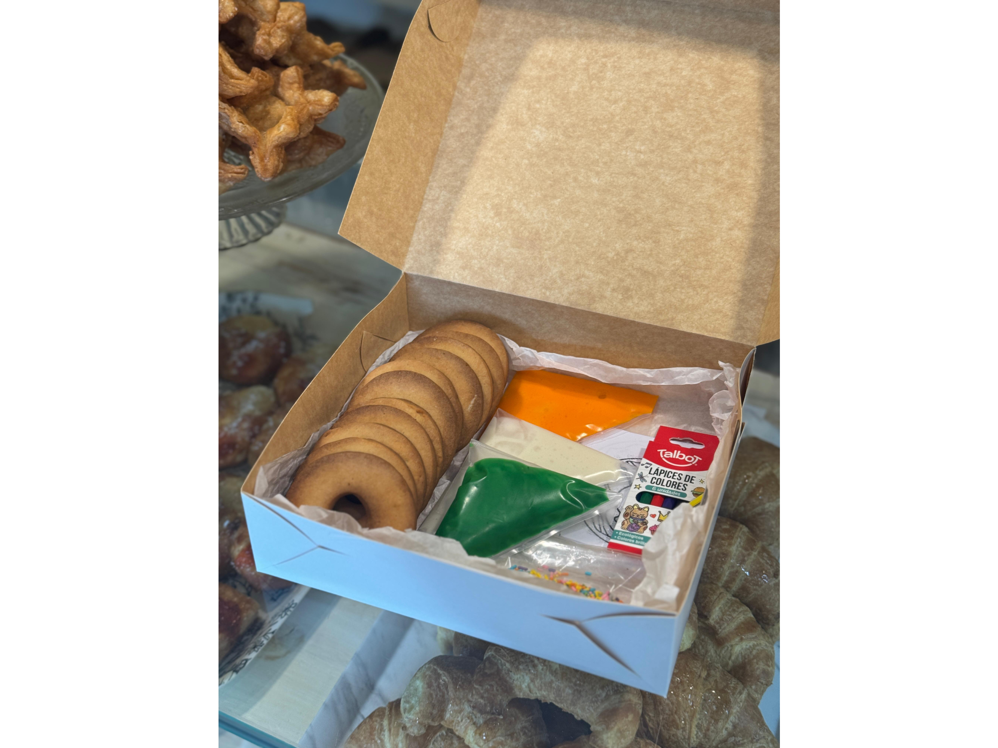 Caja #1 - SOLO POR ENCARGOCAJA # 1 💗 ✨12 galletas donas para decorar ✨3 mangas de glasé de colores ✨1 sobre con granas multicolores ✨1 cajita de lápices de colores ✨6 dibujos de donas para colorear$12.000 Observaciones 0 / 150