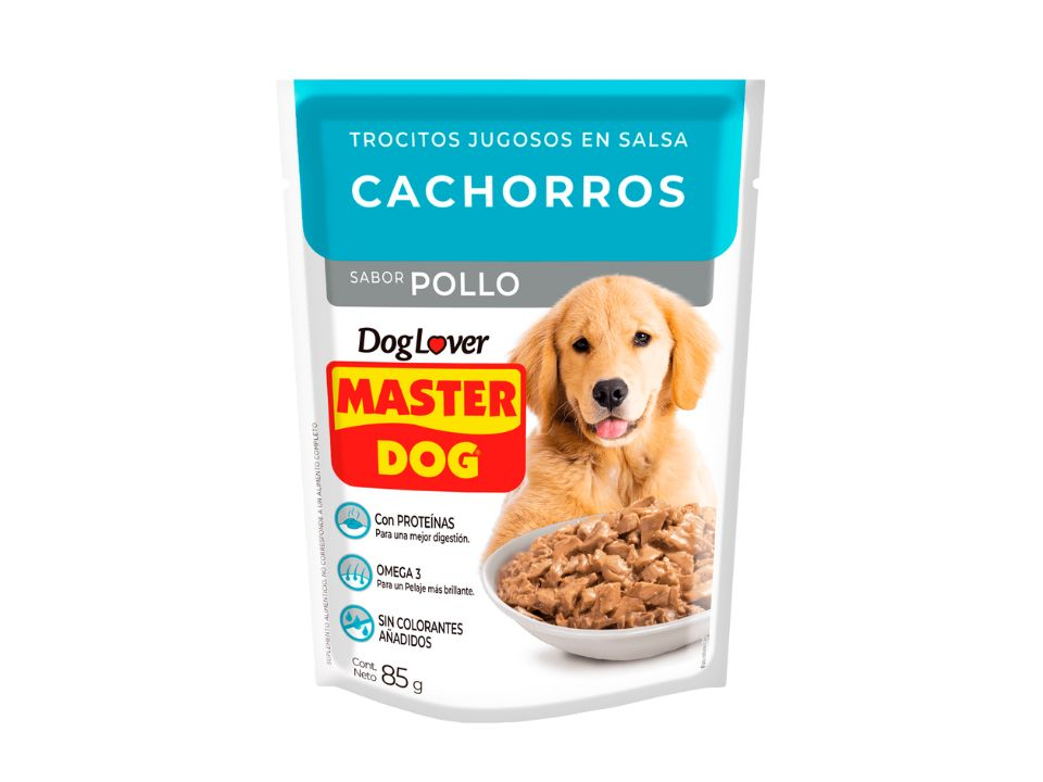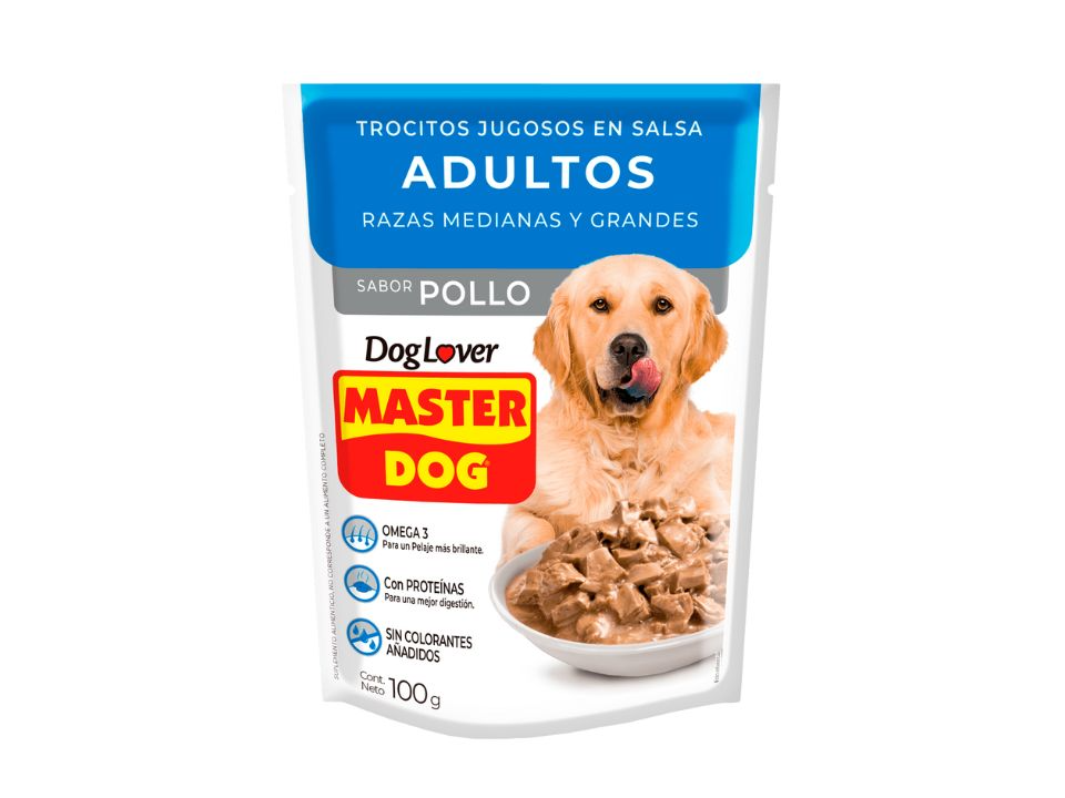 Sachet Master Dog es un alimento húmedo para perros, presentado en un sobre individual (sachet o sobrecito), que proporciona nutrición completa y balanceada para perros adultos, cachorros o de razas pequeñas, elaborado con trozos de carne o pollo en una sabrosa salsa
