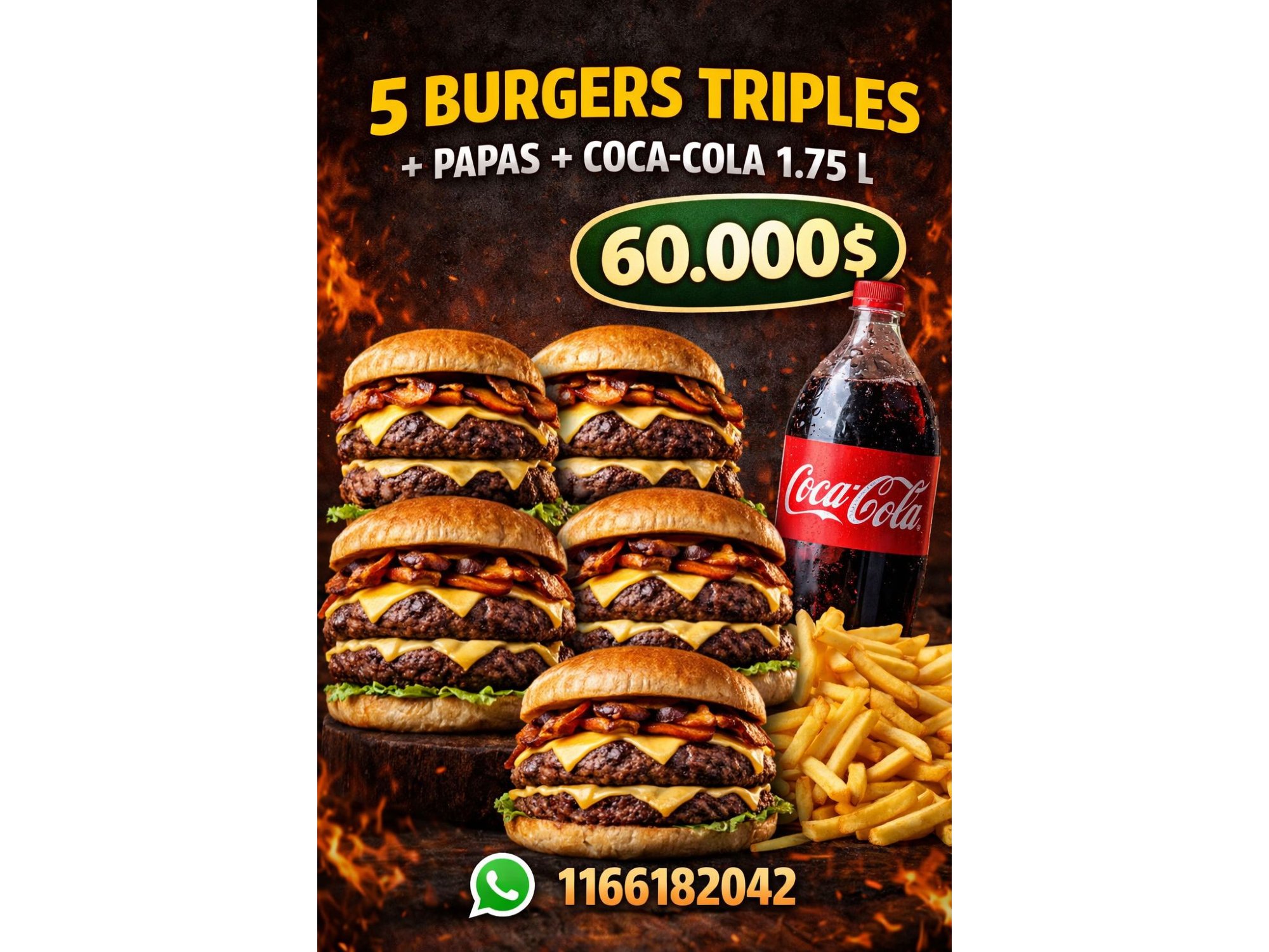 Gran promo Compartir por WhatsApp Copiar enlace 5 triples con cheddar más bacon $75.500$60.000 21% OFF