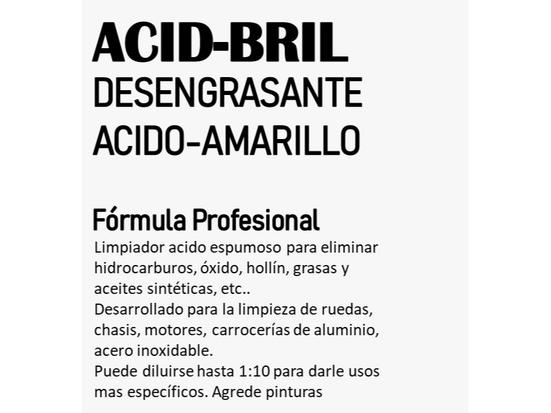 ACIDBRIL- DESENGRASANTE ACIDO AMARILLO Compartir por WhatsApp Copiar enlace Presentaciones Seleccioná las opciones que quieras.ACIDBRIL- DESENGRASANTE ACIDO AMARILLO$23.000ACIDBRILP- DESENGRASANTE ACIDO AMARILLO X4u$80.000 Observaciones 0 / 150 Encontrá productos relacionados LIMPIEZA Y BELLEZA (35)