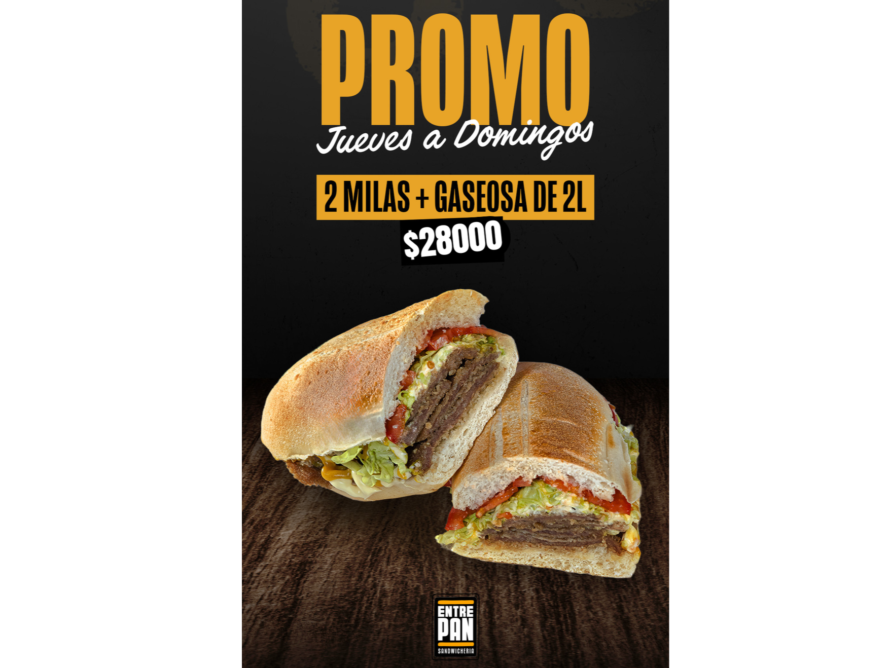 ENTRE PAN Filtros Compartir por WhatsApp Copiar enlace PROMOS Sándwiches Al Plato PROMOS (2) Promo FINDE (2 mila comun+gaseosa 2Lts) $30.800 Promo Finde 2( 1 mila+1lomito+1gaseosa 2l) $31.900 Sándwiches (6) Sándwich de milanesa $14.300 Milanesa Americana $15.600 Lomito $15.900 Vegetariano $14.200 Bondiola Americana con papas. $15.400 Bondiola Clásica con papas $14.300 Al Plato (2) Milanesa a la napolitana desde $23.100 Milanesa comùn con papas desde $20.900