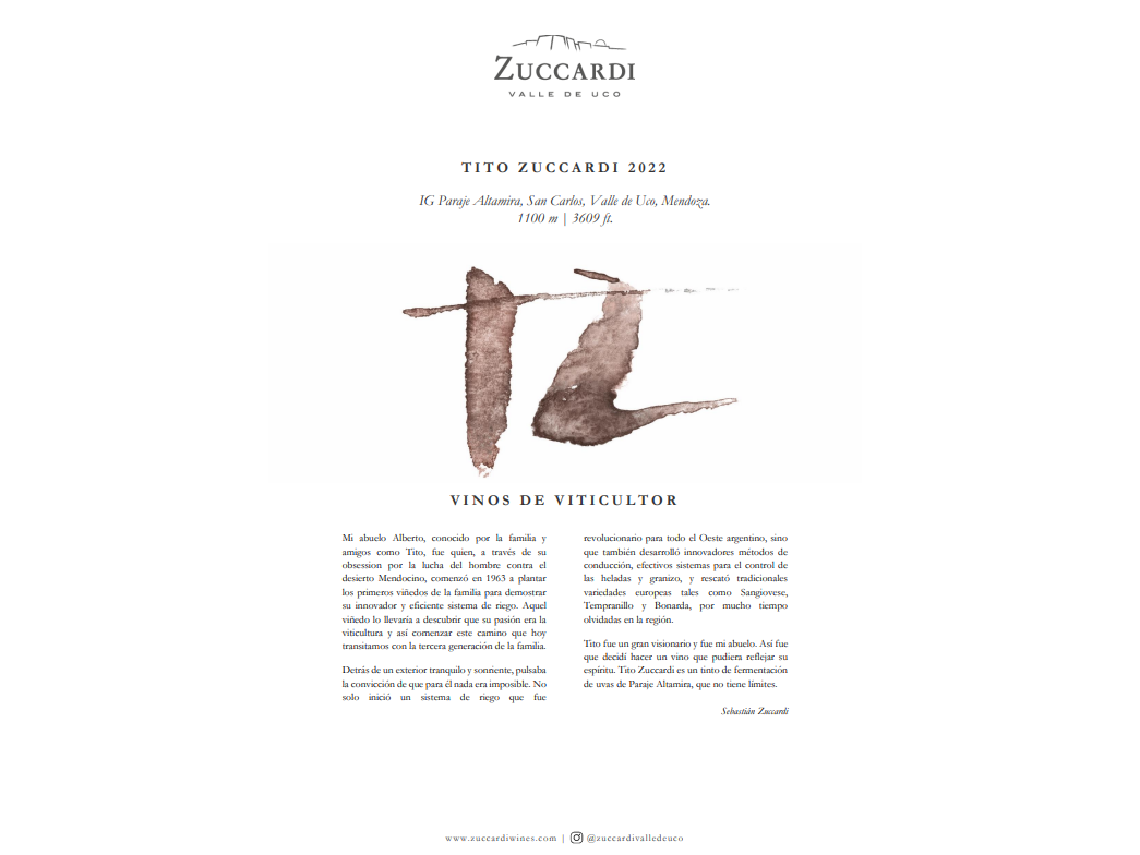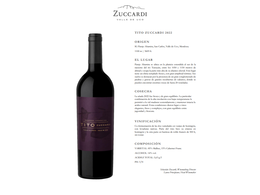 El Tito Zuccardi es un vino que se caracteriza por su color violeta profundo con reflejos azules. En nariz, se perciben aromas a frutas negras y rojas, como moras, ciruelas y cerezas, combinados con notas herbales y especiadas, como jengibre y pimienta negra. En boca, presenta una entrada sedosa con taninos suaves y jugosos, y un final largo y profundo que refleja su complejidad aromática.