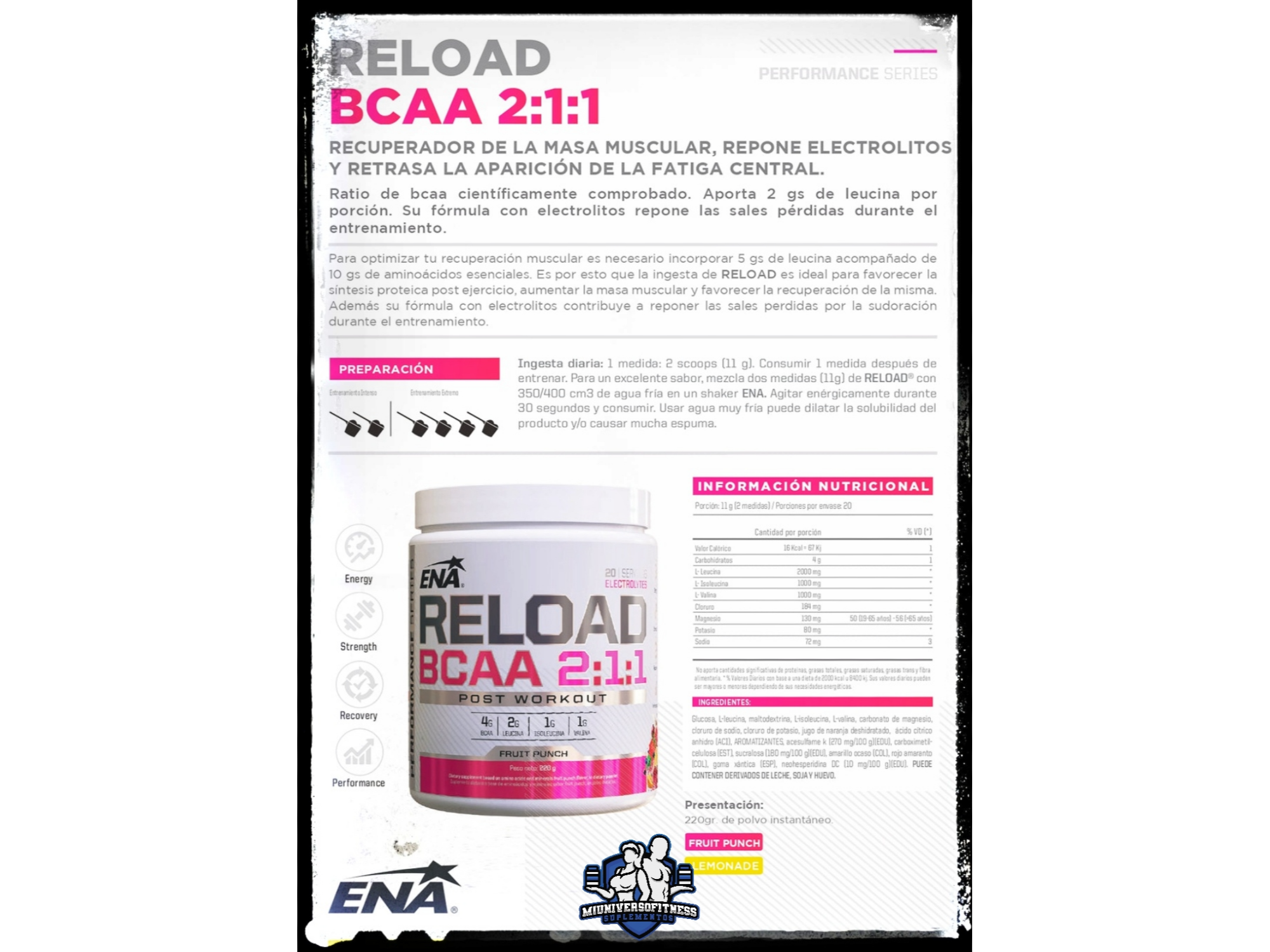 RELOAD es lo último en post entrenamiento. Ideal para después de un entrenamiento intenso. Te traemos el mejor ratio de BCAA (2:1:1) con la cantidad exacta que necesitas para recuperarte más rápido y volver nuevamente al juego.