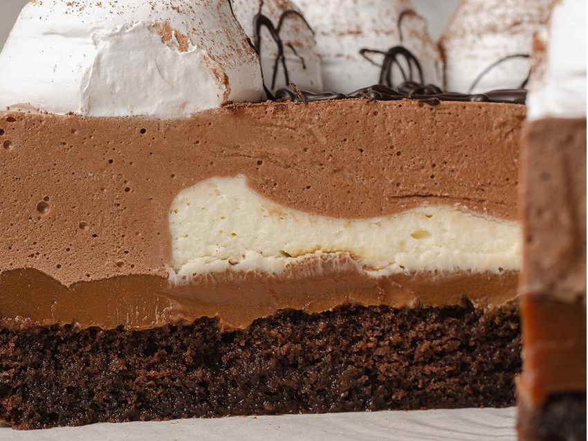 Base húmeda de chocolate, dulce de leche, crema chantilly, mousse de chocolate semi amargo, espejo de chocolate. Rinde 14/16 porciones