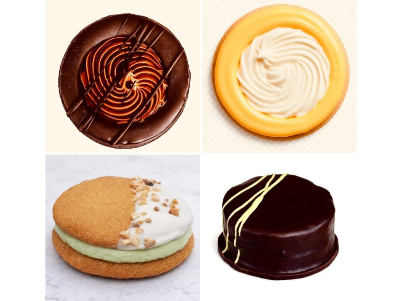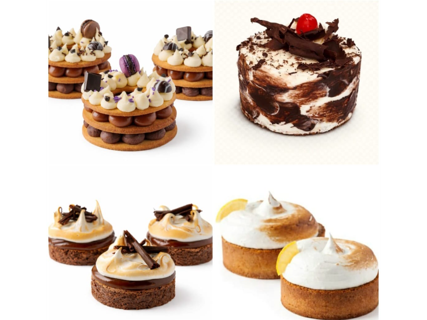 Selección de masas finas a base de cremas de chocolate, dulce de leche, mousse, maracuya, cheesecake, tiramisu, coco, bombas de crema