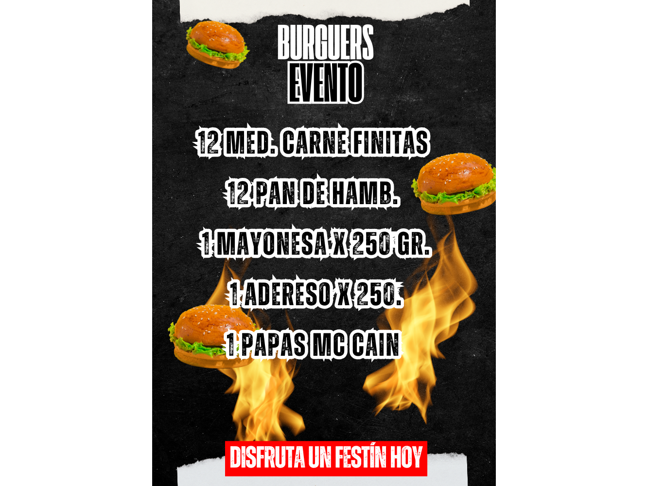 COMBO BURGUER EVENTOIdeal para Compartir. 12 medallones de carne finitas 12 panes de hamburguesa 1 mayonesa de 250g 1 aderezo de 250g 1 paquete de papas McCain Cocina y Comparte!$24.000$22.200 8% OFF Complementos para tu pedido Agregá items adicionales a tu pedido. QUE TAL UNA BEBIDA? Seleccioná las opciones que quieras.LATA 1890 X 473 CC CERVEZA RUBIA|LINEA QUILMES $1.200$1.049 13% OFF PEPSI 2,25 RETORNABLE (ENVASE DE REGALO) $2.700$2.349 13% OFF PEPSI BLACK 2,25 LT RETORNABLE (ENVASE DE REGALO) $2.700$2.349 13% OFF 7UP 2,25 LT RETORNABLE (ENVASE DE REGALO) $2.700$2.349 13% OFF Observaciones 0 / 150 Encontrá productos relacionados MEDALLÓN PURA CARNE (4) QUESO FETA DE REGALO (4)