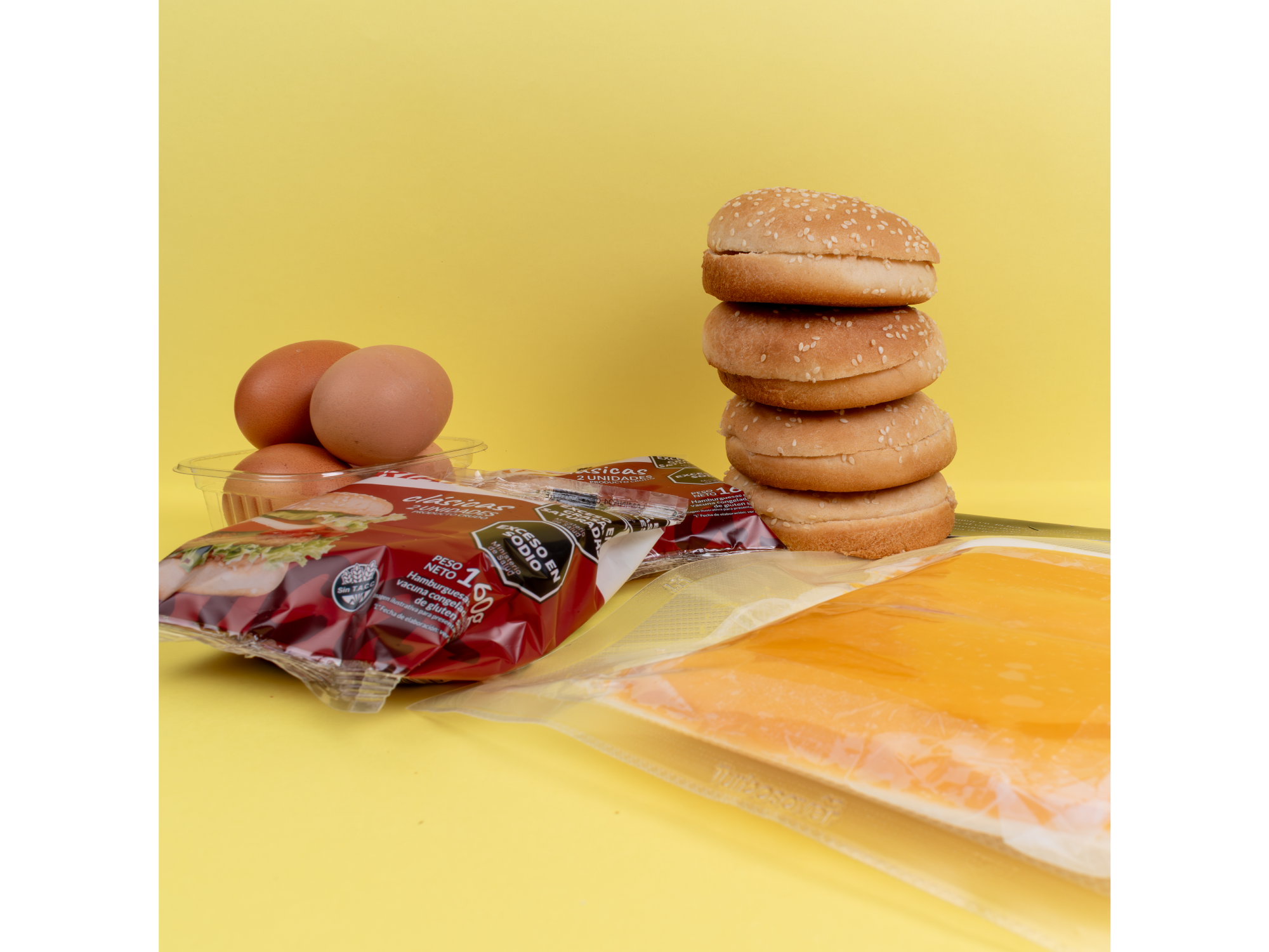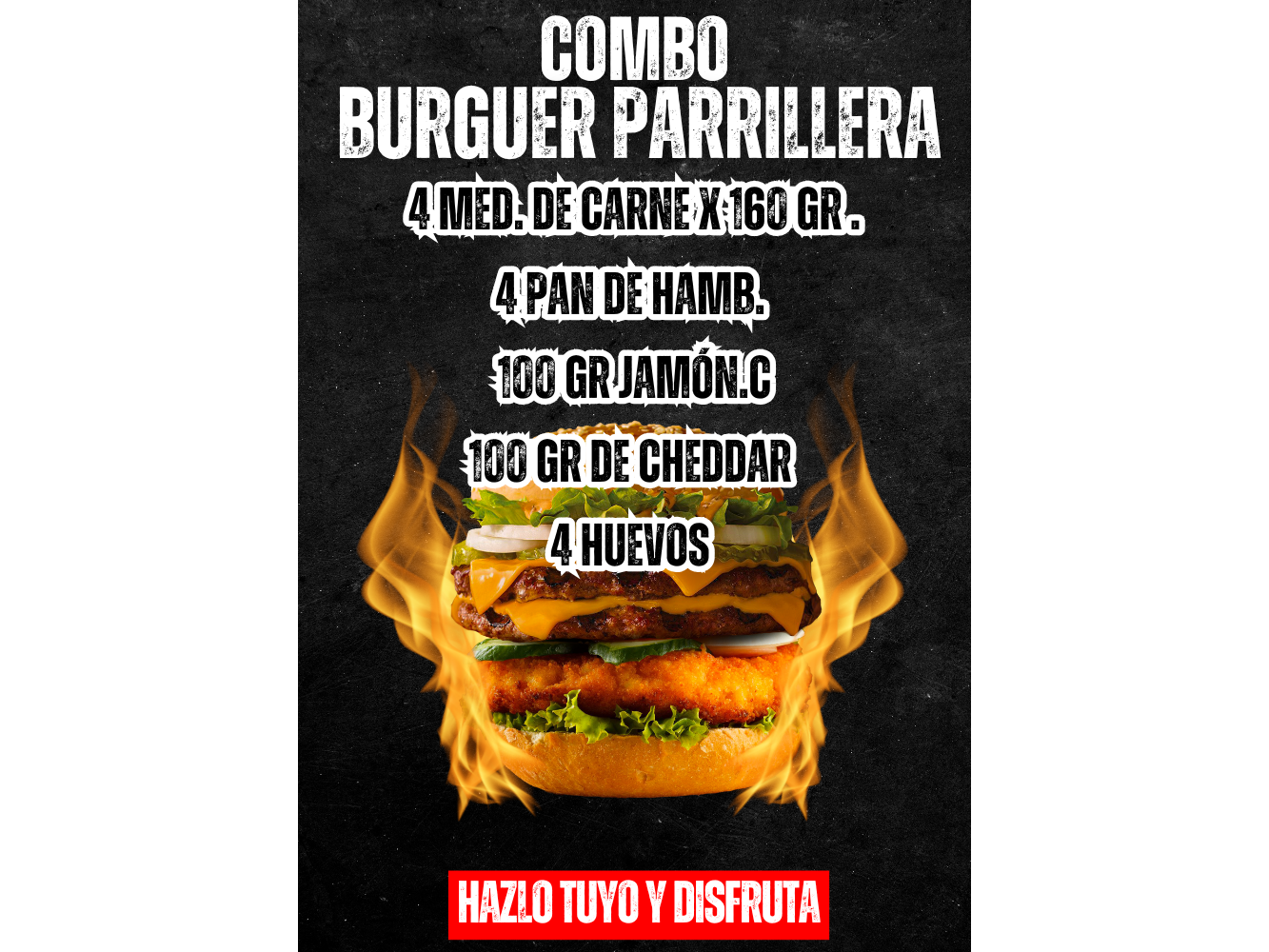 COMBO BURGUER PARRILLERASabor a lo Grande. 4 medallones de carne de 160g (friar pura carne) 4 panes de hamburguesa ( Veneziana ) 100g de jamón cocido (grassetto) 100g de cheddar (barra , brescia) 4 huevos de granja. Cocina y Disfruta!$13.500$11.997 11% OFF Complementos para tu pedido Agregá items adicionales a tu pedido. QUE TAL UNA BEBIDA? Seleccioná las opciones que quieras.LATA 1890 X 473 CC CERVEZA RUBIA|LINEA QUILMES $1.200$1.049 13% OFF PEPSI 2,25 RETORNABLE (ENVASE DE REGALO) $2.700$2.349 13% OFF PEPSI BLACK 2,25 LT RETORNABLE (ENVASE DE REGALO) $2.700$2.349 13% OFF 7UP 2,25 LT RETORNABLE (ENVASE DE REGALO) $2.700$2.349 13% OFF Observaciones 0 / 150 Encontrá productos relacionados MEDALLÓN PURA CARNE (4) QUESO FETA DE REGALO (4)