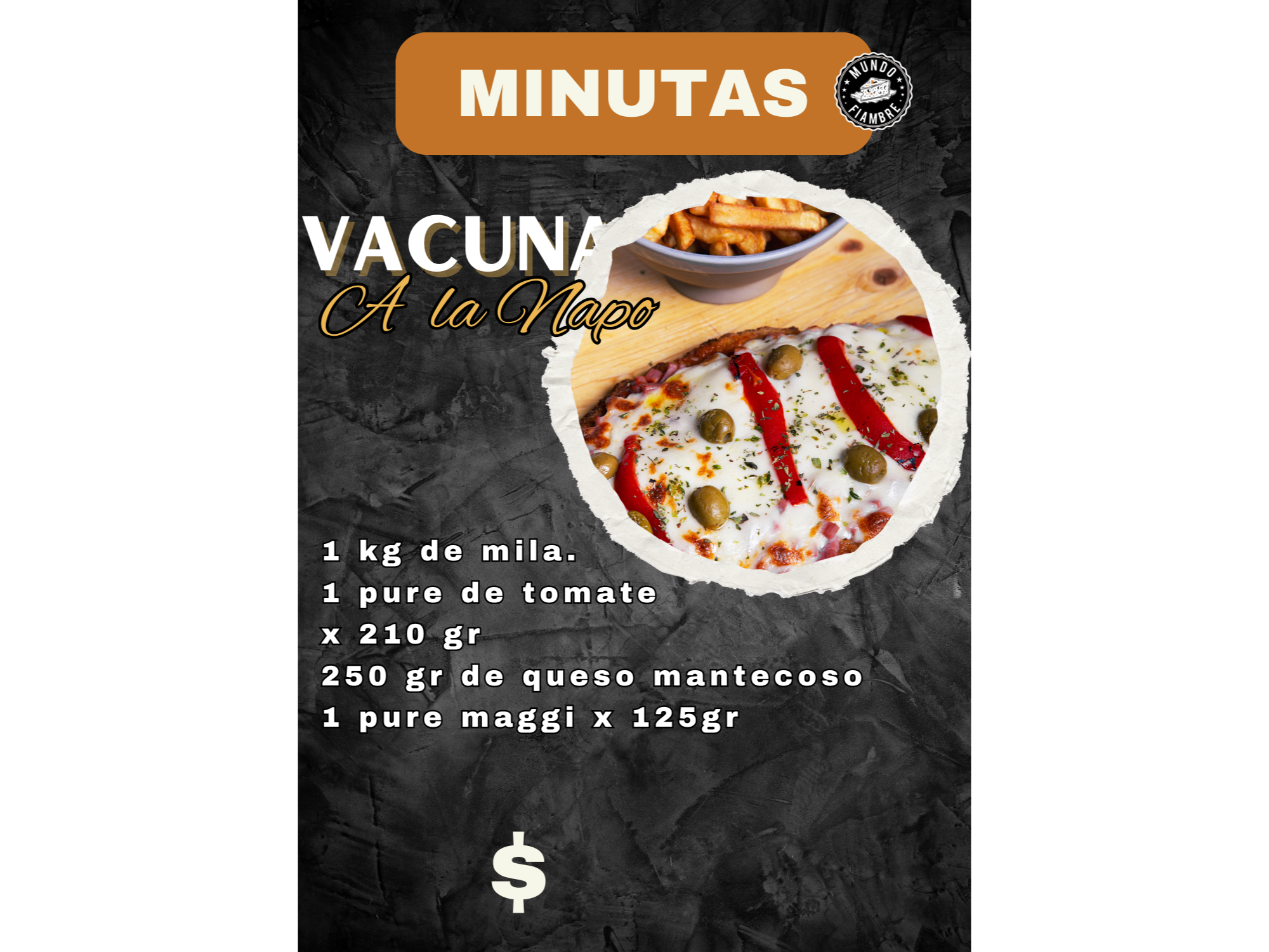 MILANESA VACUNA A LA NAPO1 kg de milanesa (elaboración propia) 1 puré de tomate x 210 gr. 250 gr de queso cremoso. 1 puré de papa maggi x 125 gr$18.300 Complementos para tu pedido Agregá items adicionales a tu pedido. QUE TAL UNA BEBIDA? Seleccioná las opciones que quieras.LATA 1890 X 473 CC CERVEZA RUBIA|LINEA QUILMES $1.200$1.049 13% OFF PEPSI 2,25 RETORNABLE (ENVASE DE REGALO) $2.700$2.349 13% OFF PEPSI BLACK 2,25 LT RETORNABLE (ENVASE DE REGALO) $2.700$2.349 13% OFF 7UP 2,25 LT RETORNABLE (ENVASE DE REGALO) $2.700$2.349 13% OFF Observaciones 0 / 150