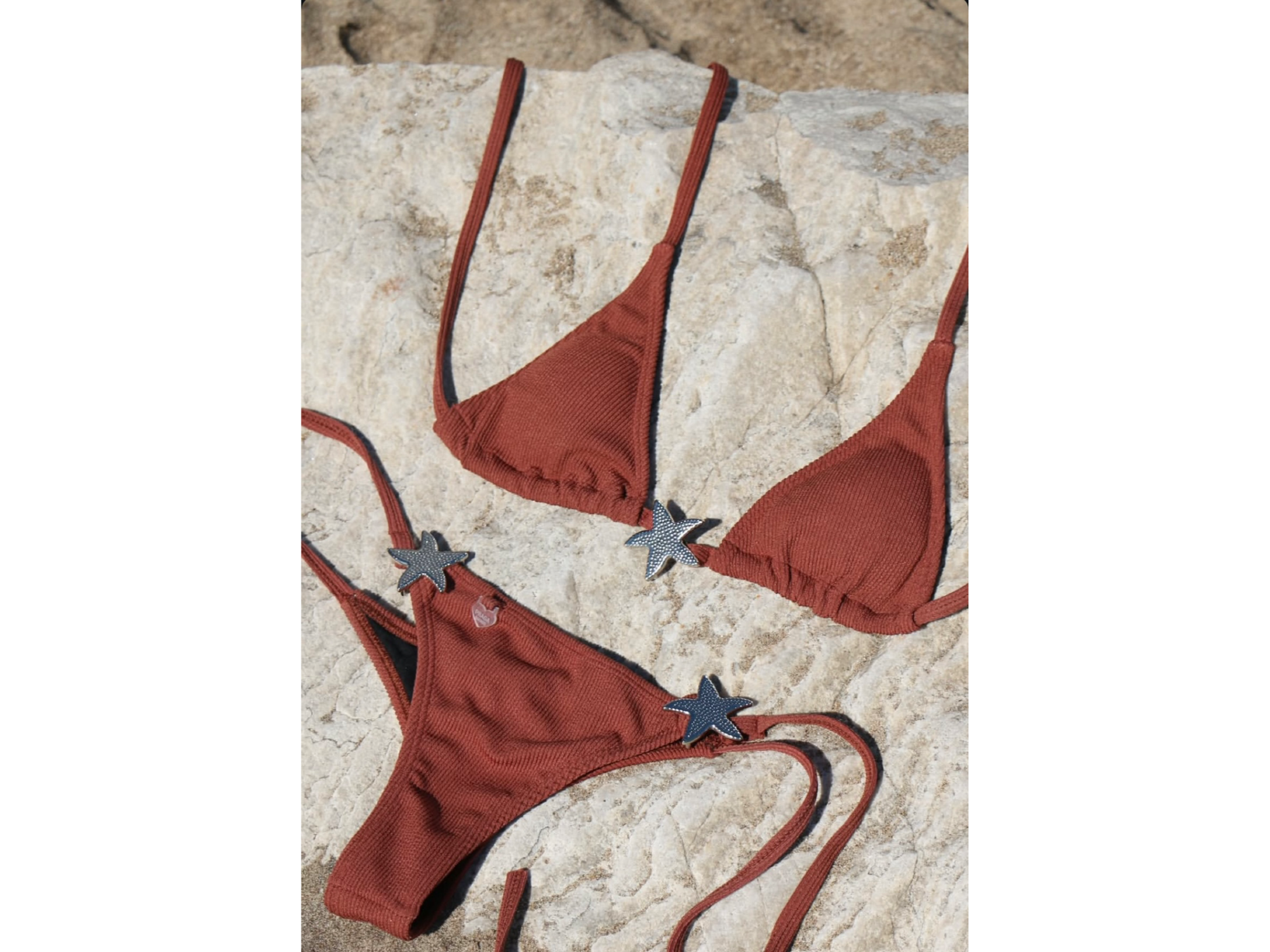 BIKINI ARIEL TEXTURA Sin stock Corpiño triángulo para atar, con detalle de estrella de mar en el centro, tazas soft desmontables. Bombacha less para atar con detalle de estrellas de mar a los costados. Color marrón Textura gruesa Talle 85-90/2$59.000 Observaciones 0 / 150