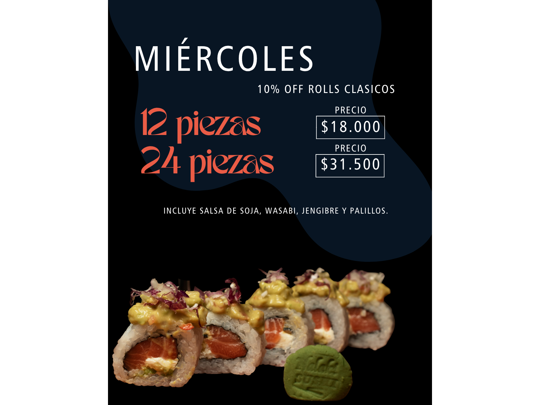 PROMOCIONES VIGENTES Compartir por WhatsApp Copiar enlace Sólo valida los días miercoles, 10% OFF en clásicos! Sólo válida los días jueves Otros Sólo valida los días miercoles, 10% OFF en clásicos! (1) PROMO MIERCOLES desde $18.000 Sólo válida los días jueves (1) PROMO JUEVES OMAKASE desde $17.000 Otros (5) 12 rolls full salmón y langostinos. $21.000$19.000 10% OFF 12 HOT + 12 CLÁSICOS (24 piezas) $44.000$38.000 14% OFF MENÚ PARA 1 10 piezas $26.500$18.500 30% OFF promo 18 piezas $40.500$28.000 31% OFF BARCO 20 ROLLS $35.000$27.000 23% OFF