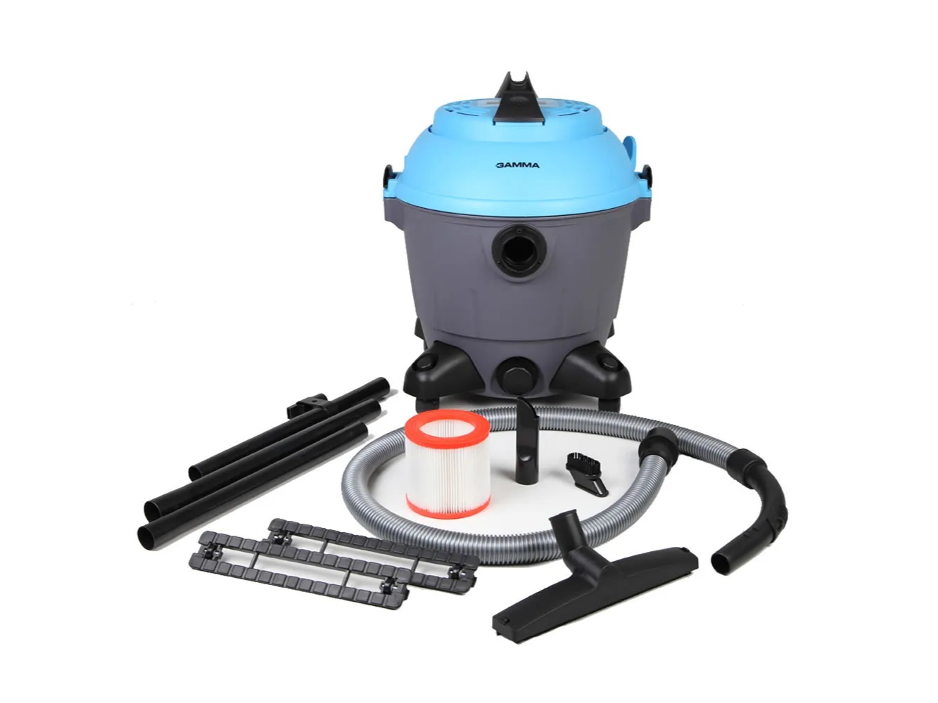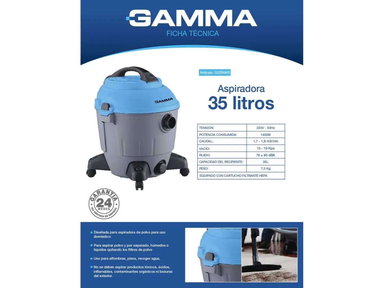 La aspiradora Gamma de 35 litros (modelo G2204/G2204ARA) es un equipo potente de 1400W diseñado para uso profesional o doméstico intenso, capaz de aspirar sólidos y líquidos, y funcionar como sopladora. Cuenta con un tacho plástico de alta capacidad, filtro HEPA lavable, y un caudal de aire de 1.7 - 1.9