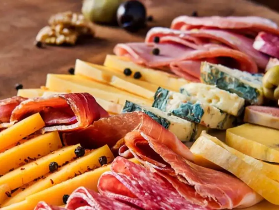 Jamón cocido, jamón crudo, bondiola, salame, queso azul, papas fritas, milanesas cortadas (ternera y pollo), patitas, bastones de muzzarella, cazuela de salchichas, aceitunas verdes, aceitunas negras.