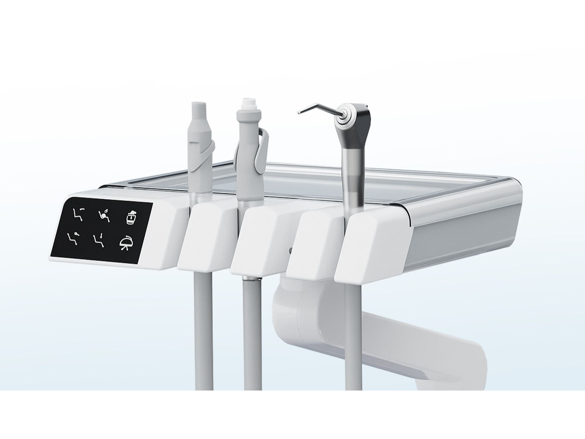 • Panel táctil infrarrojo: Control de posición del sillón, enjuague de salivadera, calentamiento de agua, llenado de vasos y luz del sillón.