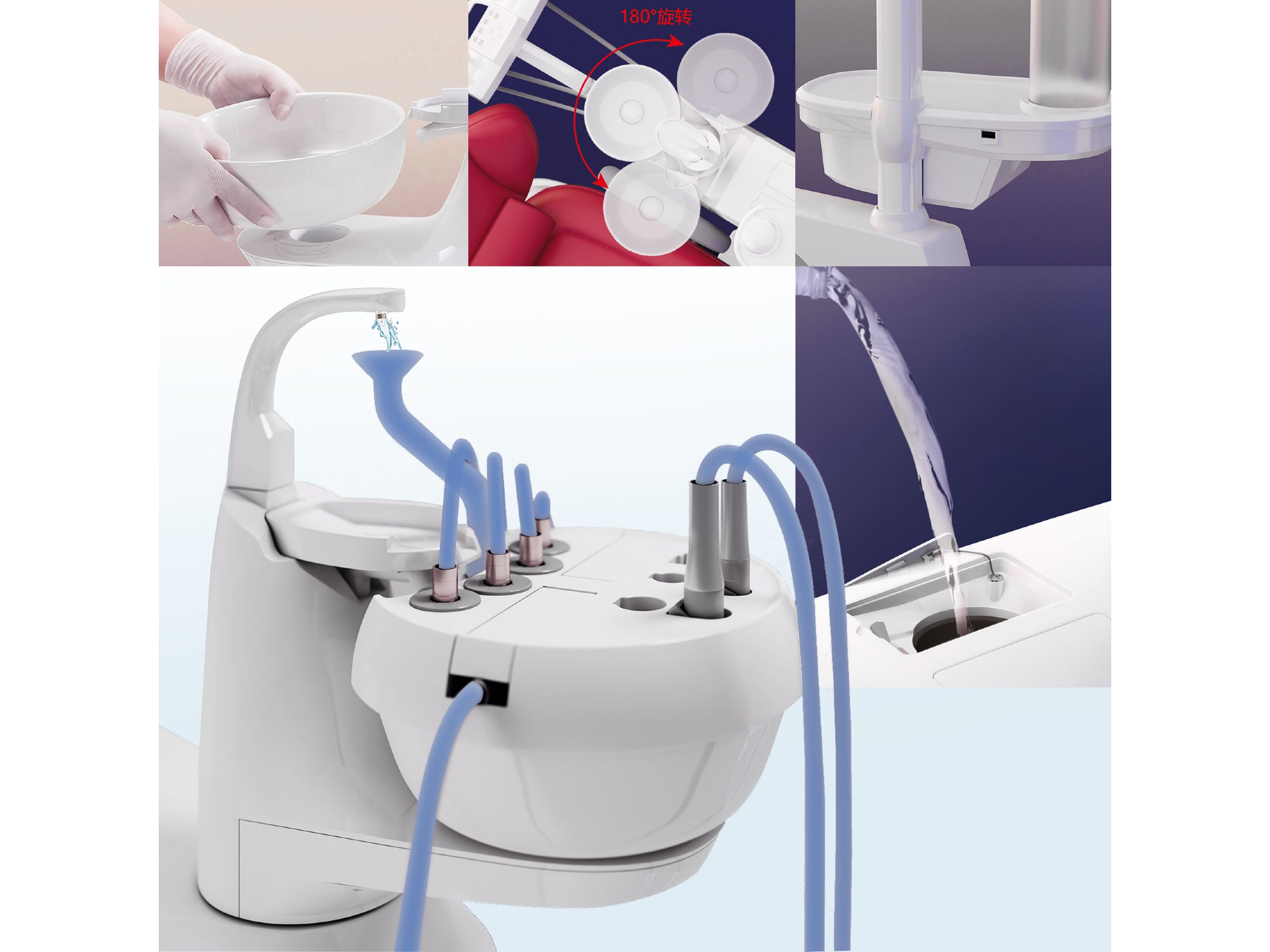 • Salivadera de cerámica giratoria 180°: Versatilidad durante los procedimientos; profunda y de gran capacidad, desmontable para limpieza/desinfección y con dispositivo de lavado para mantener el área impecable.