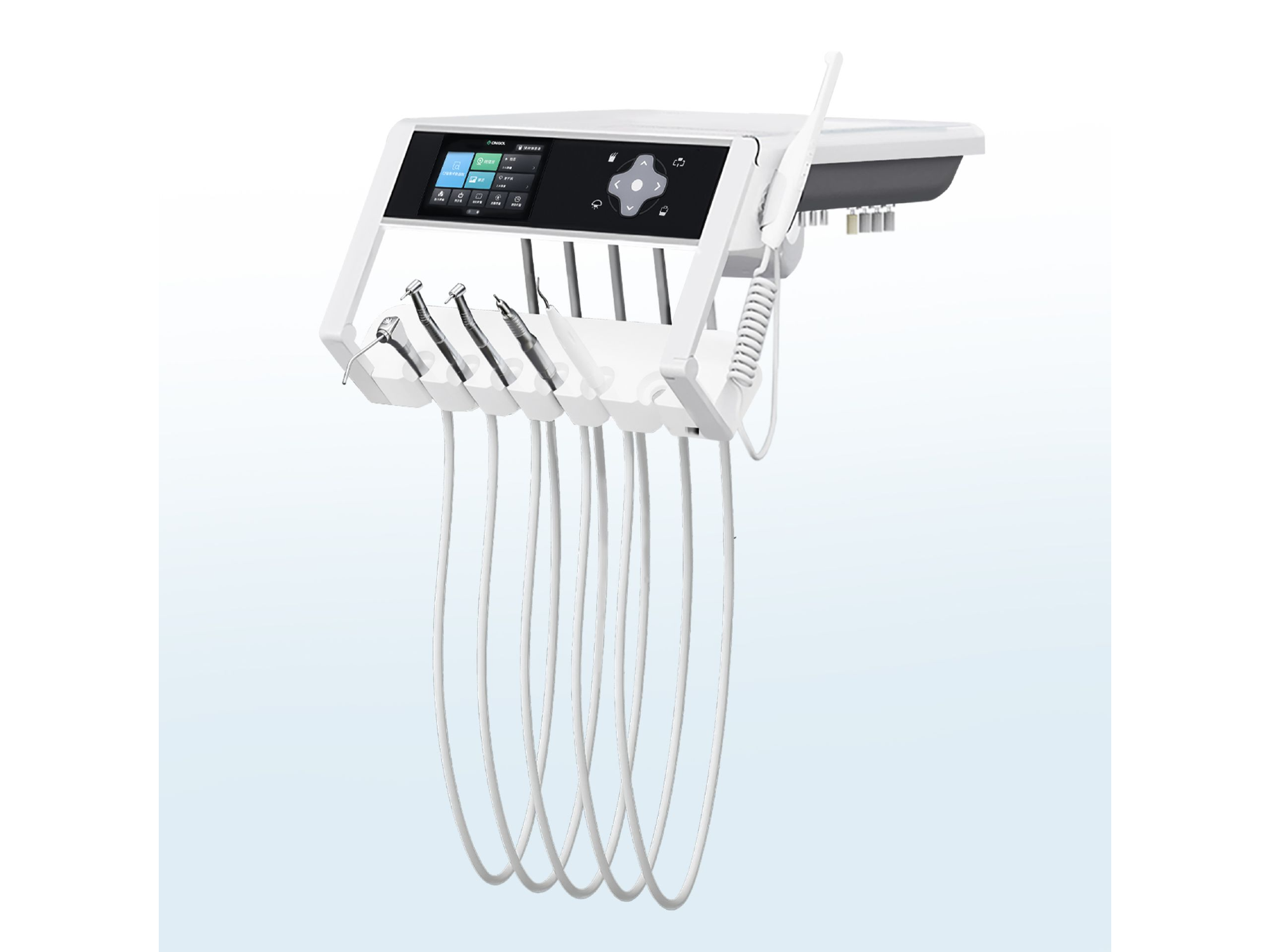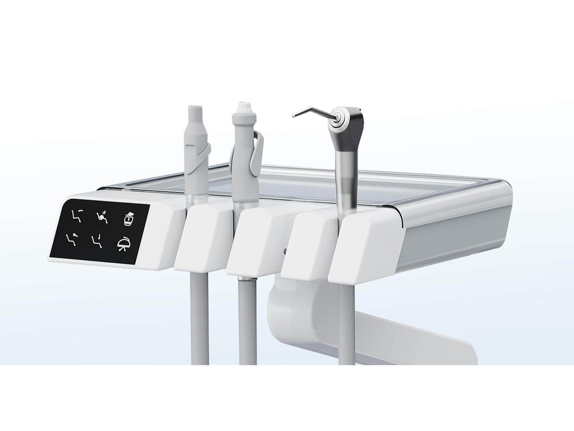 • Bandeja tipo colgante con pantalla táctil de 7": Diseño europeo que facilita el acceso a instrumentos; cubierta acrílica completa para protección contra polvo y golpes. Interfaz Smart C4 Link (en español) con control de memorias, agua/aire, modo limpieza “C”, gestión del foco y autodiagnóstico. Permite integrar micromotor eléctrico y cavitador desde la misma pantalla.