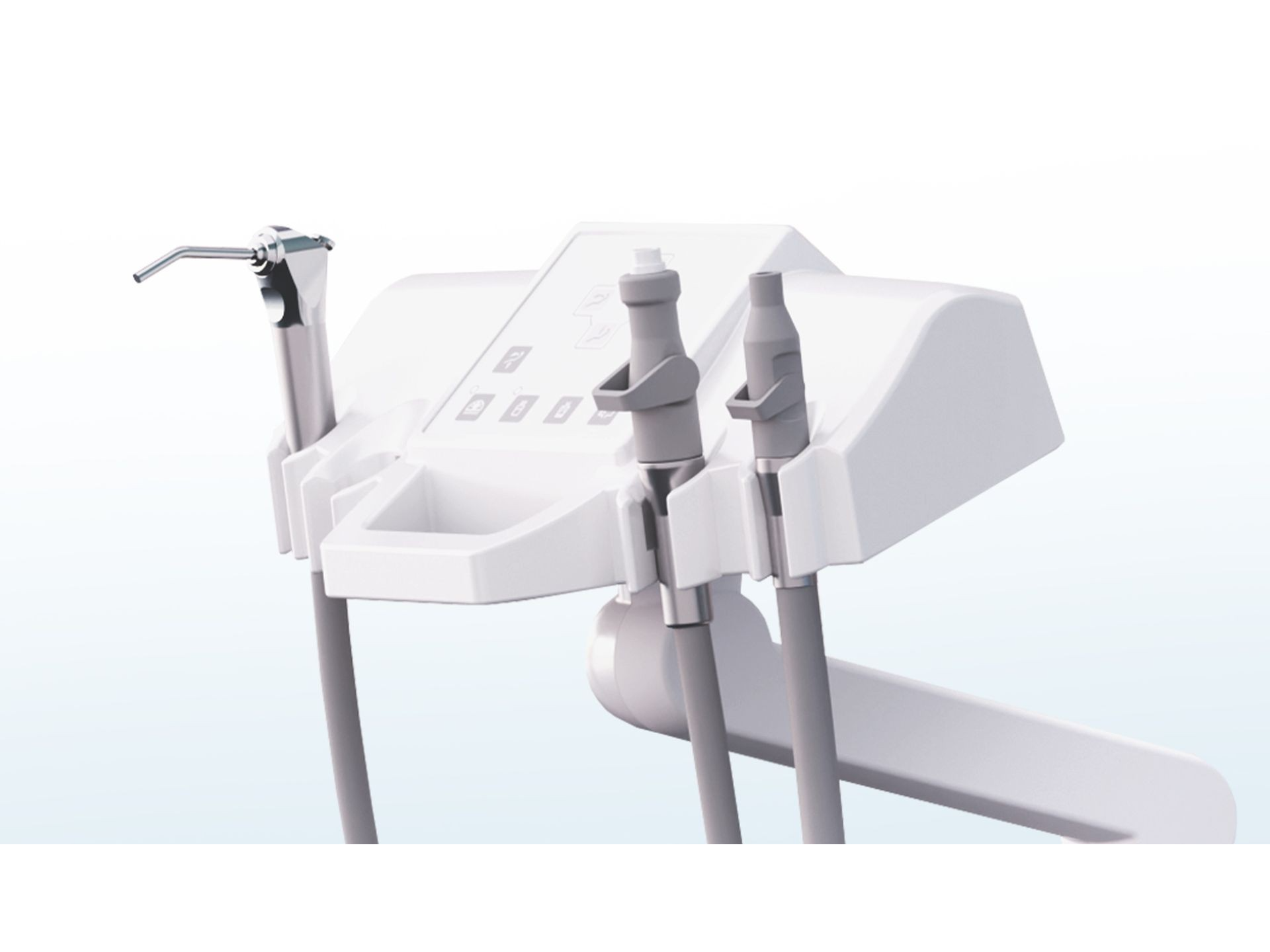 • Diseño para trabajo a cuatro manos (4 posiciones): Jeringa triple, alta succión (Venturi), baja succión (Venturi) y 1 salida adicional (p. ej., lámpara de fotocurado u otro dispositivo).