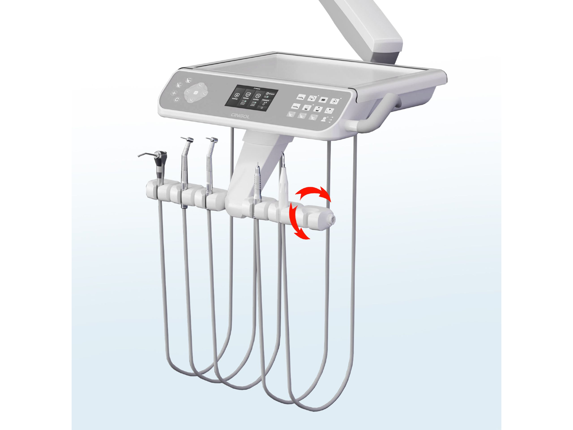 • Diseño ergonómico con 6 salidas colgantes: Cada colgante posee rotación vertical independiente para organizar instrumentos según la técnica de trabajo. Cuenta con 3 salidas neumáticas, 1 jeringa triple (Incluida) y 2 salidas adicionales para micromotor eléctrico y cavitador (No Includios). Conectores de aleación de titanio para piezas de mano y mangueras siliconadas americanas para una experiencia cómoda y duradera.