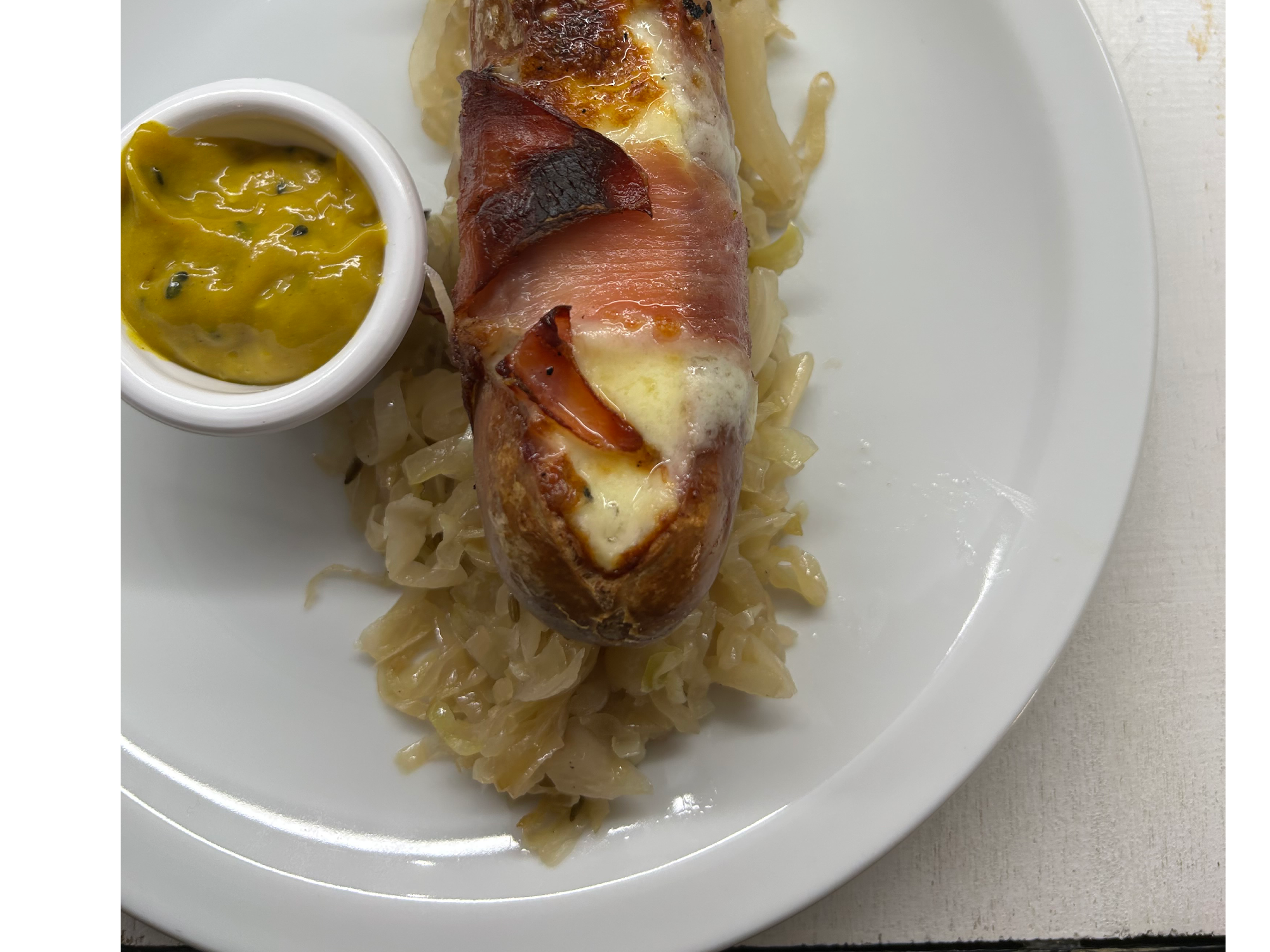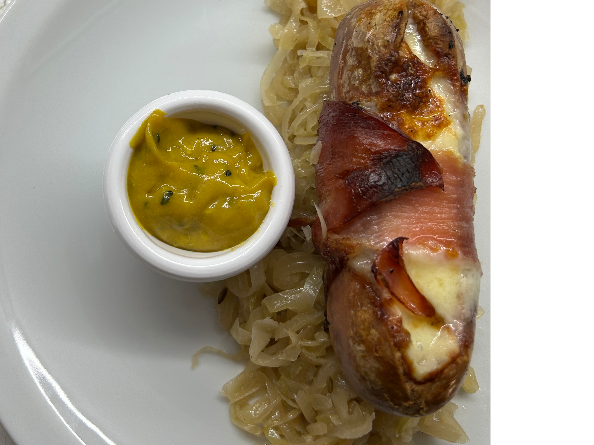 Plato Alemán Compartir por WhatsApp Copiar enlace Salchicha Berna con Muzzarella , Envuelta en panceta ahumada con chucrut , Dip de Mostaza y Miel Acompañada de papas fritas$18.000 Observaciones 0 / 150