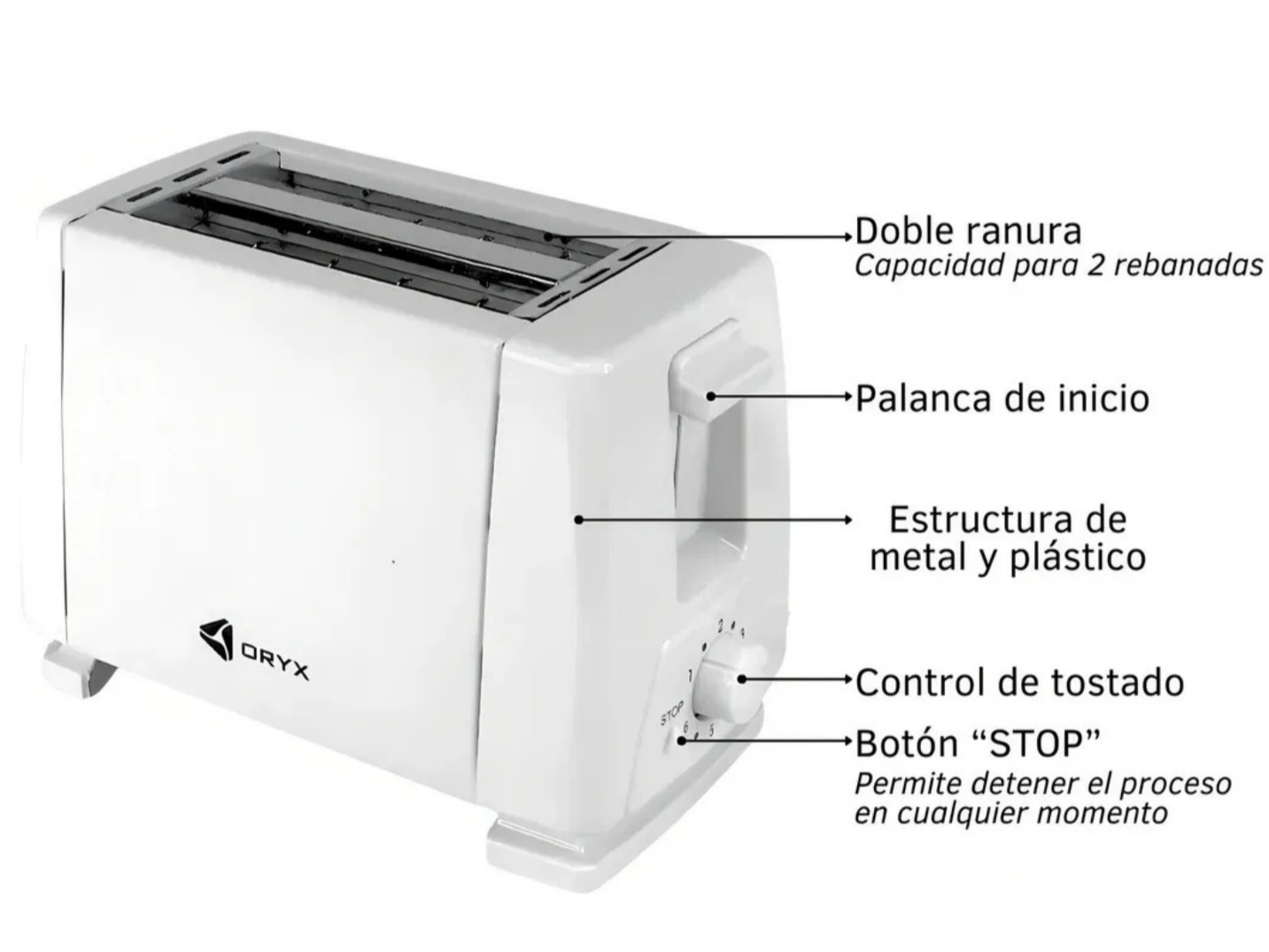 2 unidades en stock Tostadora eléctrica Oryx con 2 ranuras, ideal para preparar tostadas de forma rápida y pareja.