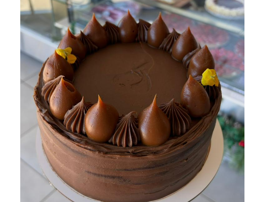 Torta de bizcochuelo de chocolate húmeda, rellena y cubierta de crema de chocolate.