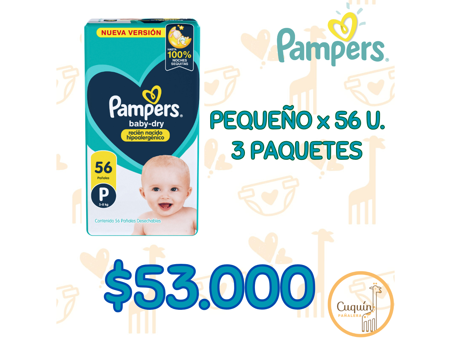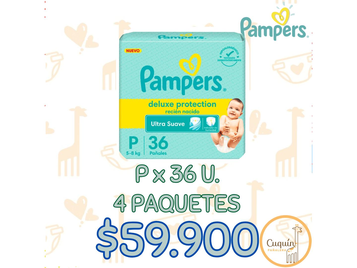 OFERTAS PAMPERS Compartir Presentaciones Seleccioná las opciones que quieras.4 Paquete - Pampers Baby-Dry RN+ x 36 (6 Kilos)$60.000$52.500 13% OFF 3 Paquete - Pampers Baby-Dry P x 56$60.000$53.000 12% OFF 4 Paquete - Pampers Deluxe RN x 36 (4 Kilos)$72.800$63.900 12% OFF 4 Paquete - Pampers Deluxe RN+ x 56 (6 Kilos)$99.600$87.500 12% OFF 4 Paquete - Pampers Deluxe P x 36$68.000$59.900 12% OFF Complementos para tu pedido Agregá items adicionales a tu pedido. Toallitas Humedas Seleccioná las opciones que quieras.3 Unidades Q-Soft Oleo Calcareo$10.0003 Unidades Huggies Limpieza Efectiva x 48 u.$10.500 Observaciones 0 / 150
