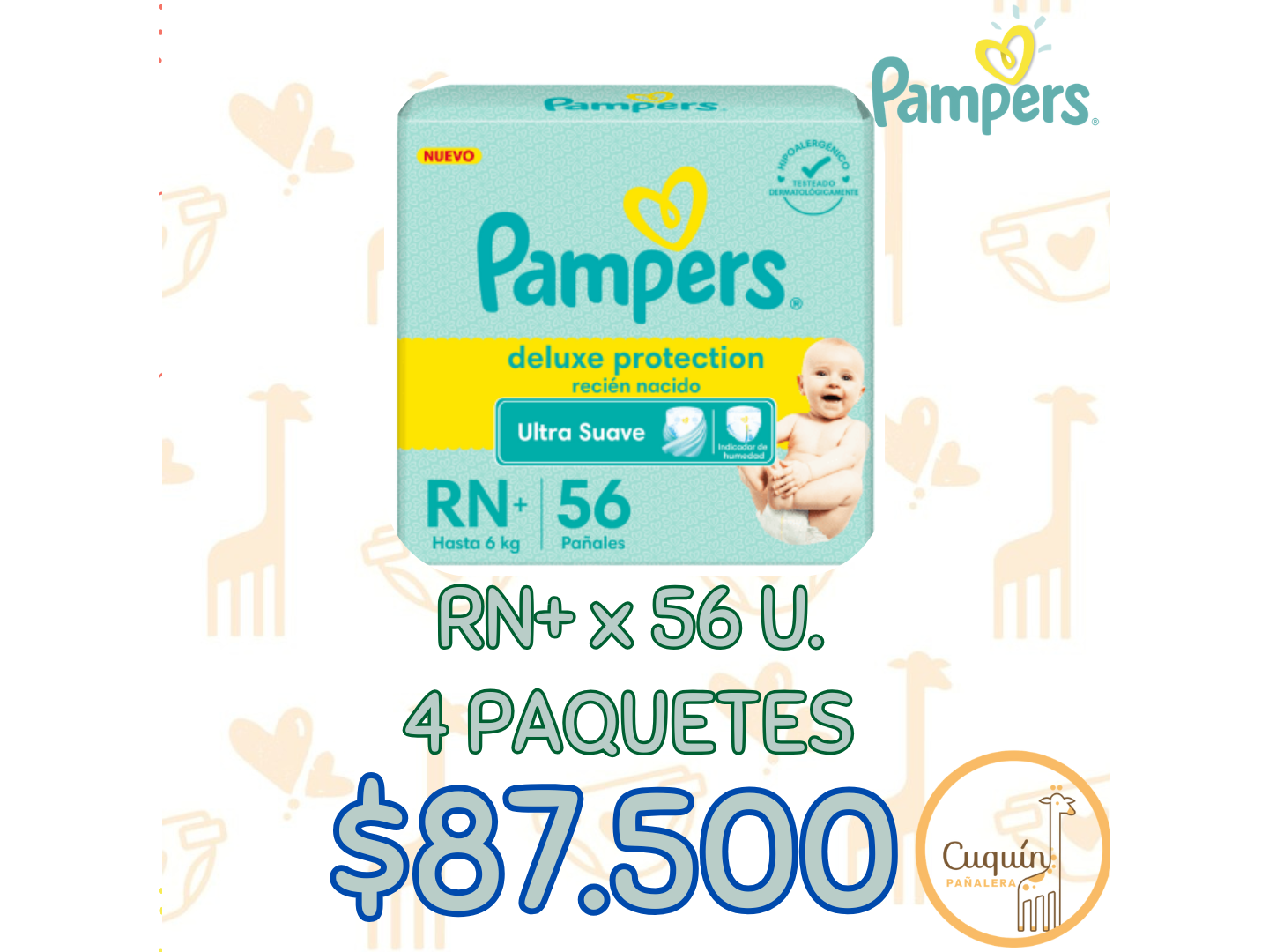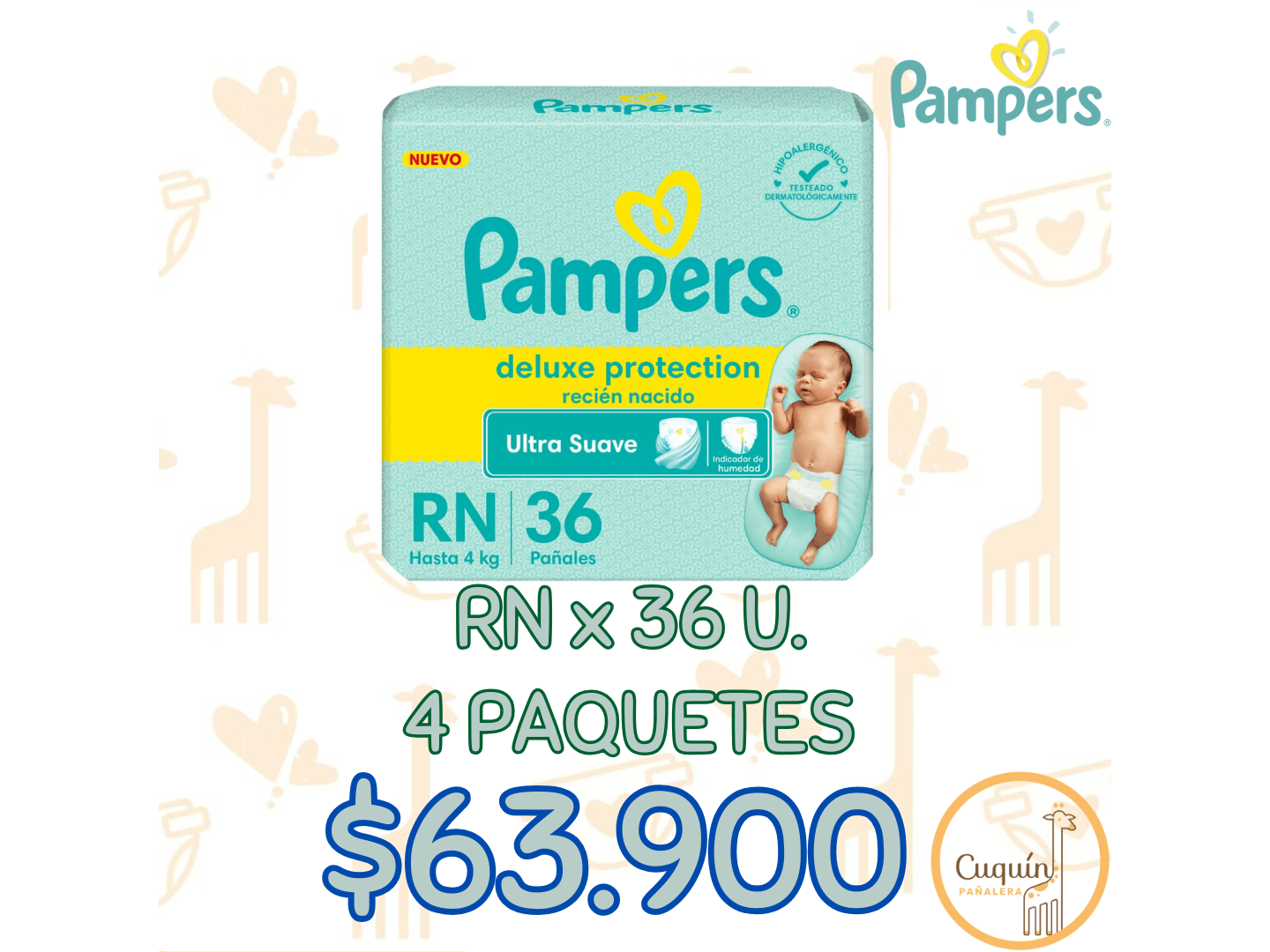 OFERTAS PAMPERS Compartir Presentaciones Seleccioná las opciones que quieras.4 Paquete - Pampers Baby-Dry RN+ x 36 (6 Kilos)$60.000$52.500 13% OFF 3 Paquete - Pampers Baby-Dry P x 56$60.000$53.000 12% OFF 4 Paquete - Pampers Deluxe RN x 36 (4 Kilos)$72.800$63.900 12% OFF 4 Paquete - Pampers Deluxe RN+ x 56 (6 Kilos)$99.600$87.500 12% OFF 4 Paquete - Pampers Deluxe P x 36$68.000$59.900 12% OFF Complementos para tu pedido Agregá items adicionales a tu pedido. Toallitas Humedas Seleccioná las opciones que quieras.3 Unidades Q-Soft Oleo Calcareo$10.0003 Unidades Huggies Limpieza Efectiva x 48 u.$10.500 Observaciones 0 / 150