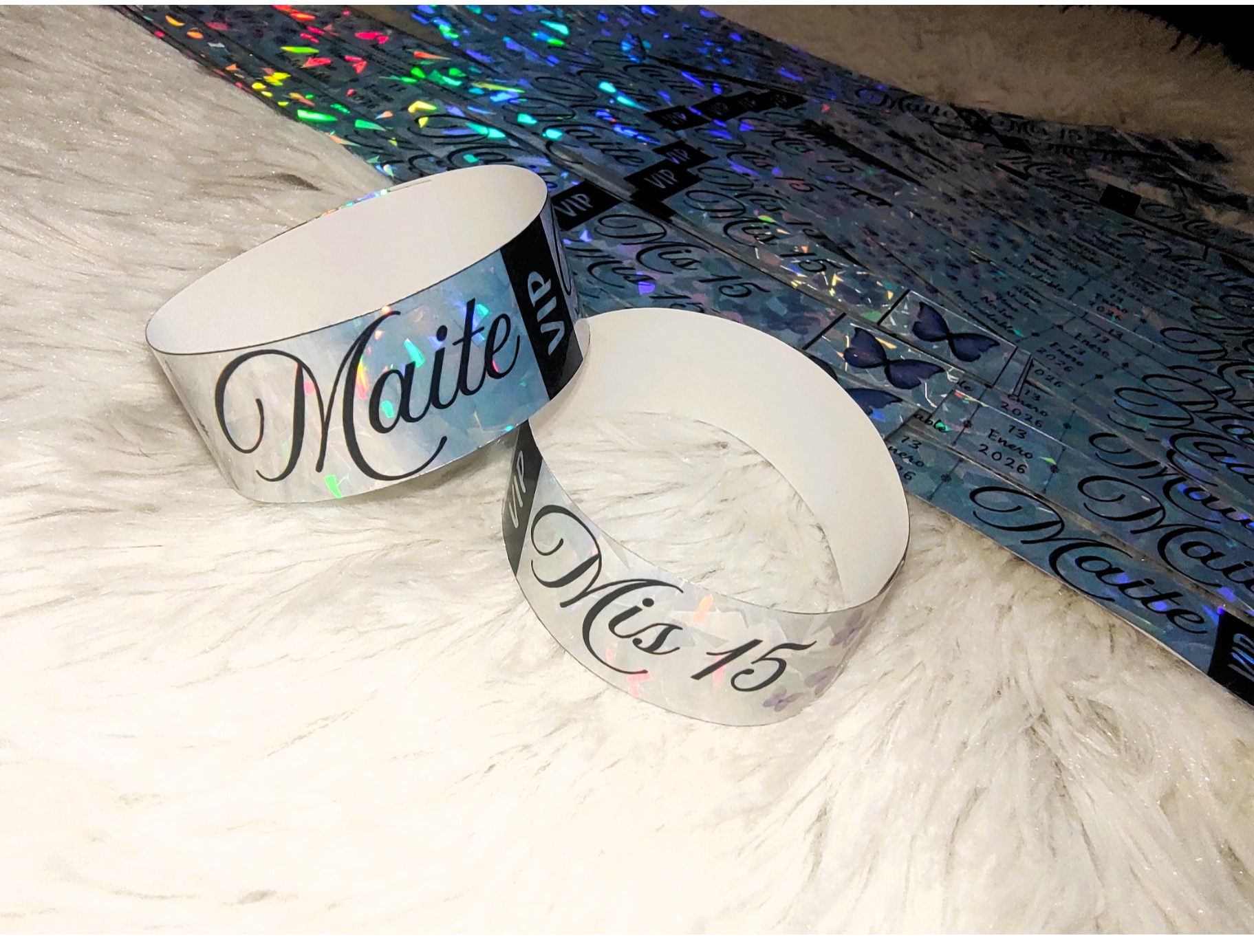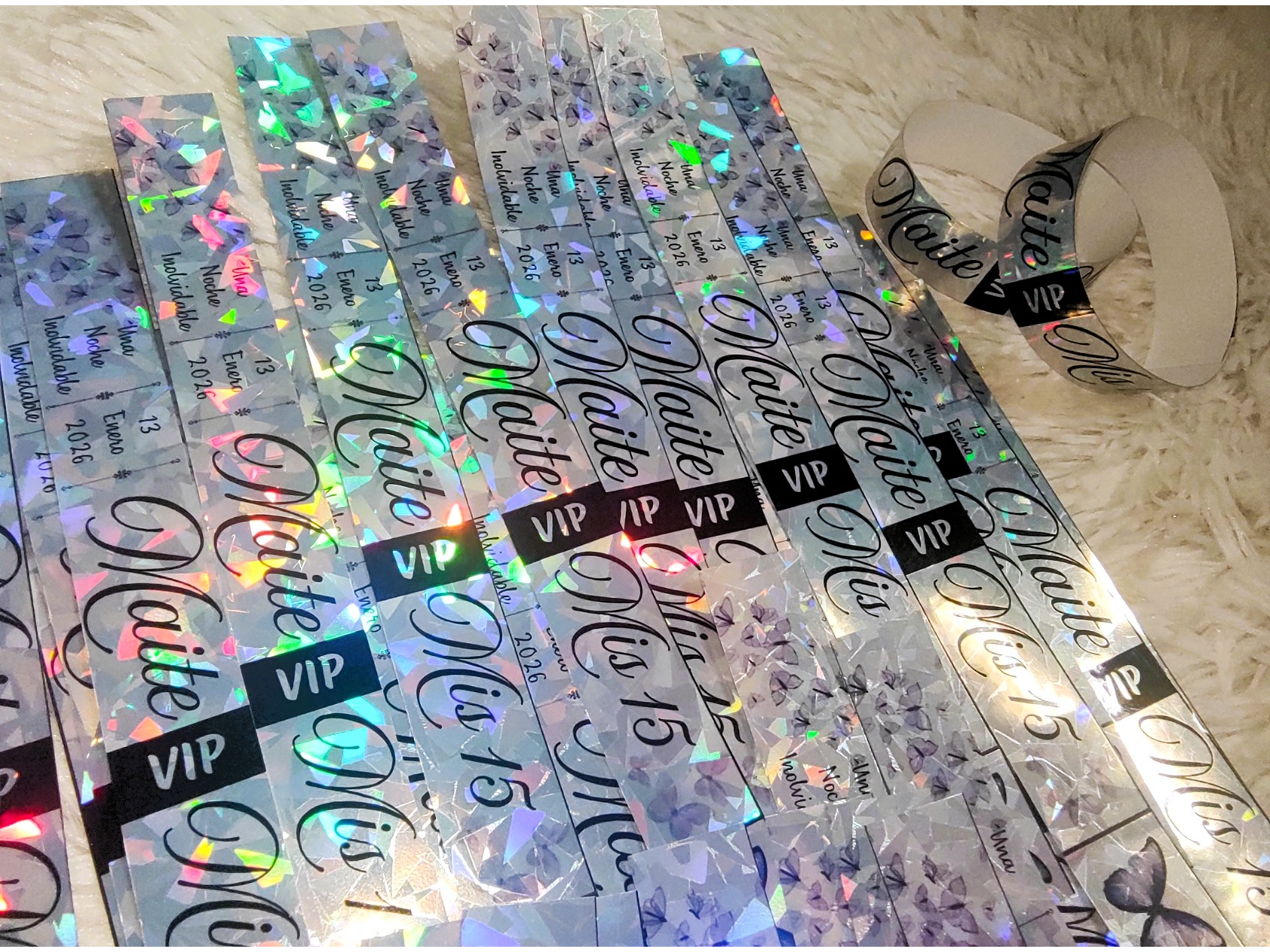 Pulseras Holográficas Compartir por WhatsApp Copiar enlace Pulseras Holográficas, Con Diseño de la temática, Nombre de la quinceañera y Fecha de la celebración. Presentaciones Seleccioná las opciones que quieras.COMBO x24 Pulseras$12.000$8.500 29% OFF x Unidad$800$500 38% OFF Observaciones 0 / 150